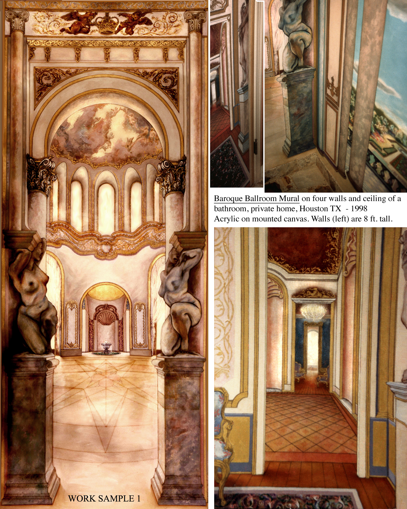 I am a professional fine artist with a diverse portfolio ranging from the most ornate Baroque ballroom adorning the walls and ceiling of a tiny private bathroom, to a life-size 3-dimensional winged angel portraying a beloved surfer after his death at sea.