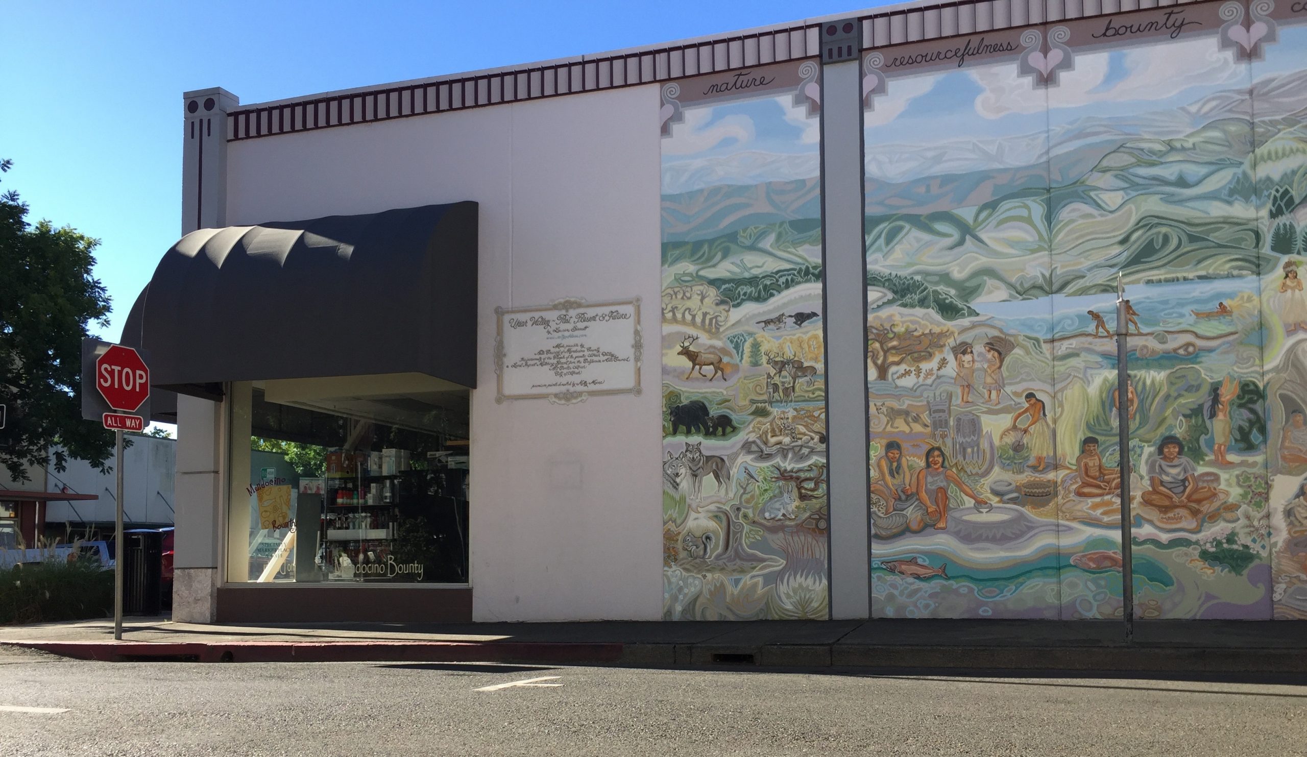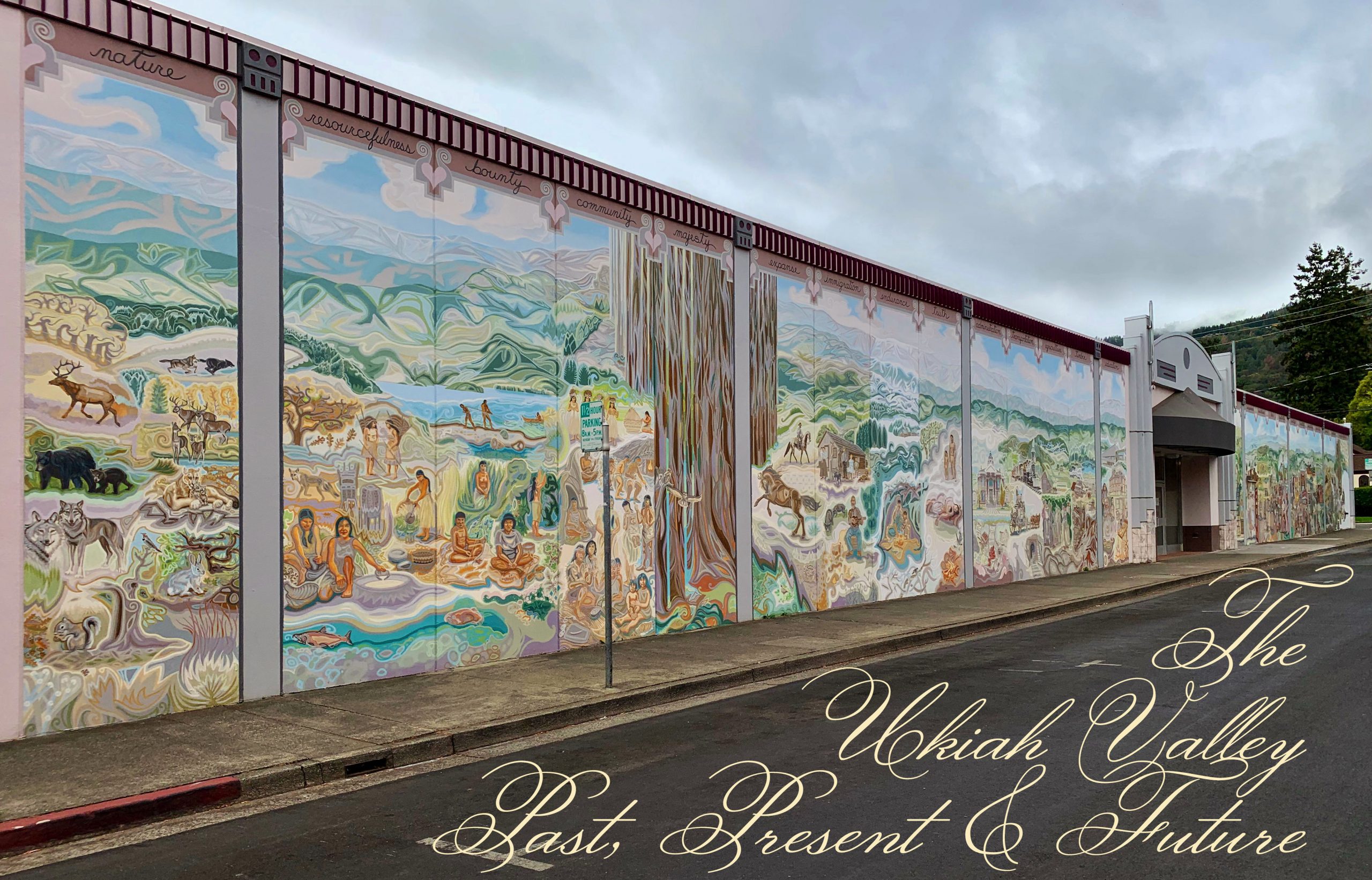 Mendocino County’s largest mural runs the length of an entire city block on the north wall of the Ukiah Valley Conference Center in downtown Ukiah, California.