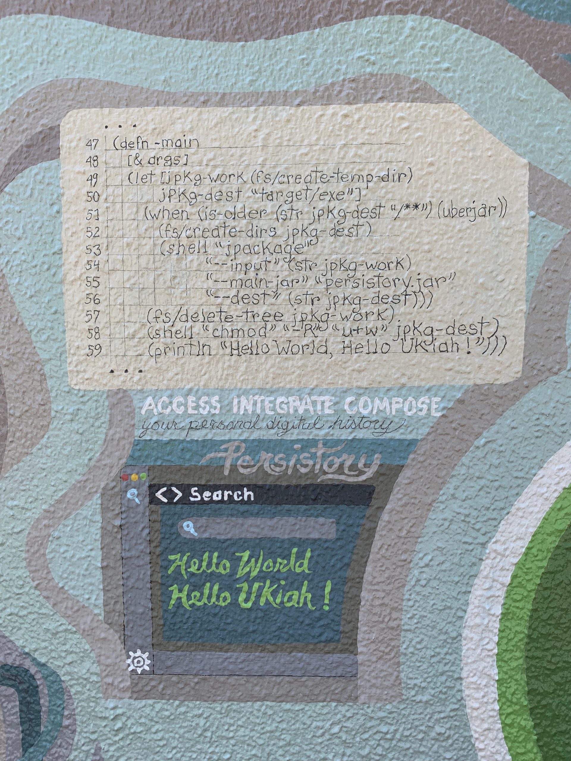 Ian was developing an app called Persistory that would act like an internal Google, allowing you to search among all of your own digital activity. Here you see the app’s front end – its appearance on screen as it is introduced to Ukiah – along with the code itself!