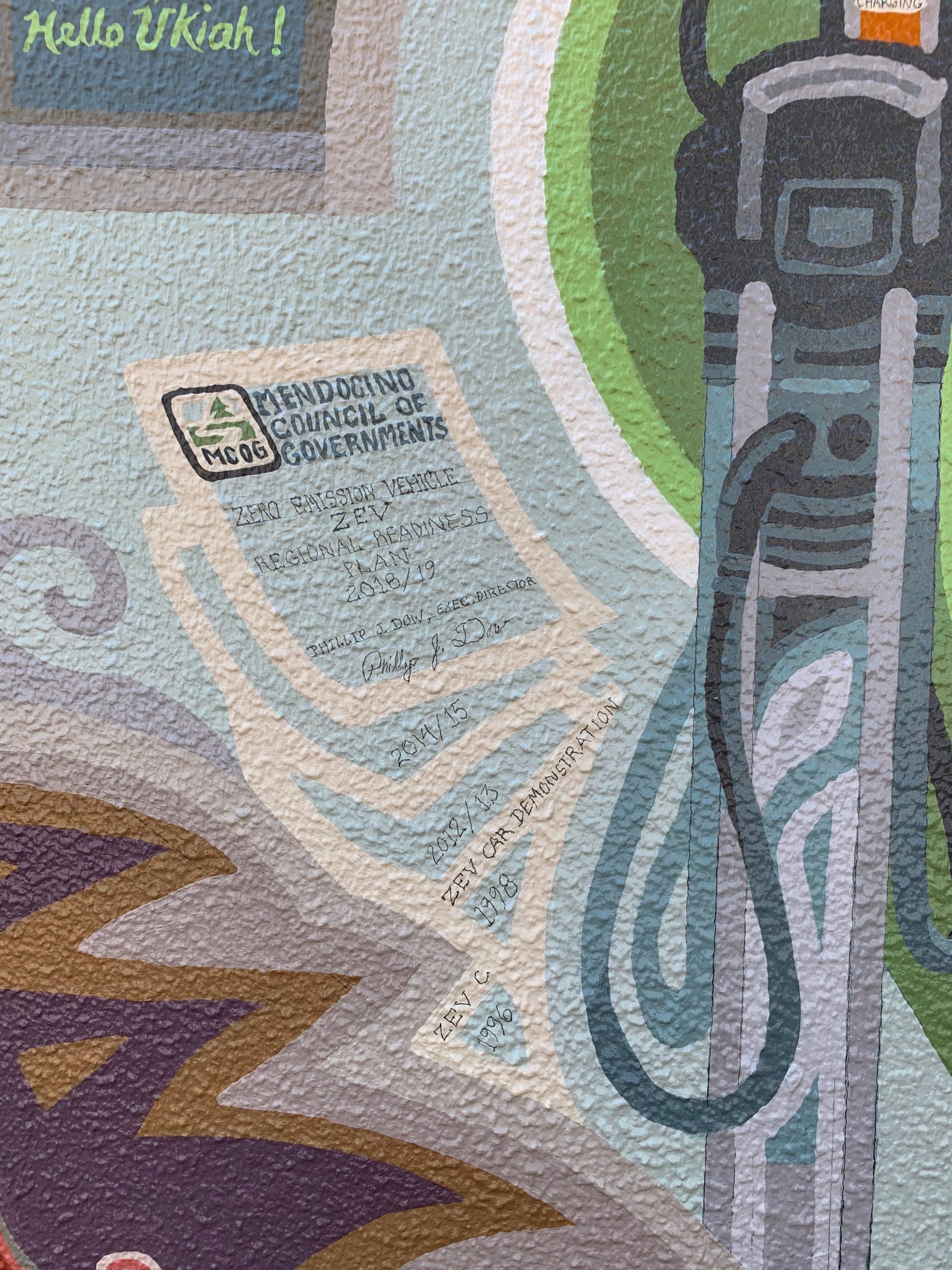 That light green expanse between Ian and Janet looks cool, but it would soon be filled with Ian’s code and MCOG’s EV plans. First, I painted a cascade of ZEV planning documents from 1996 to 2019. The smallest lettering is done in pencil, difficult on this rough surface!