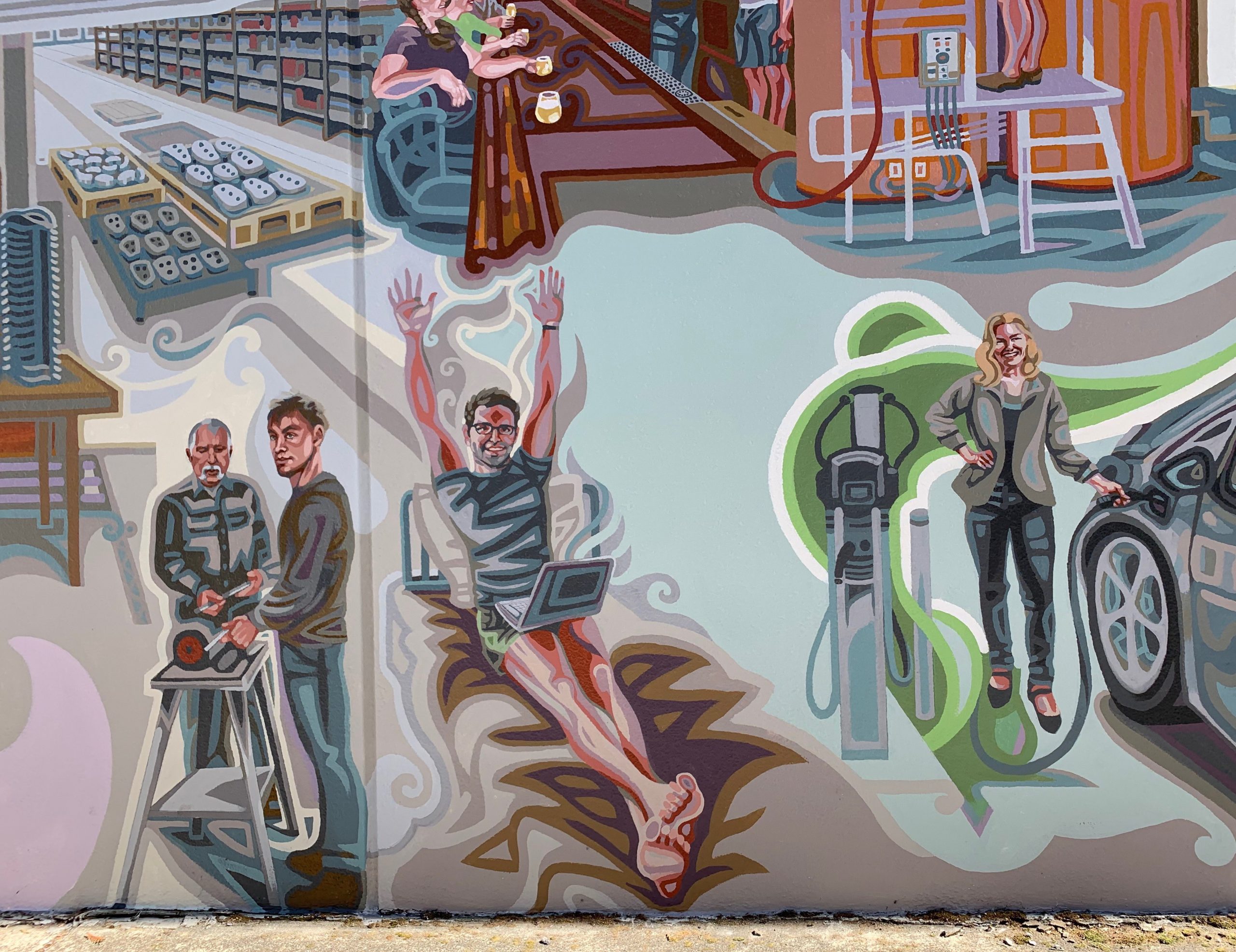 Two more illustrations of innovation are a young computer coder working remotely from home (notice the bare feet, working on his bed!) and a woman charging her electric vehicle. But first, let me show you something I painted UNDER that scene.