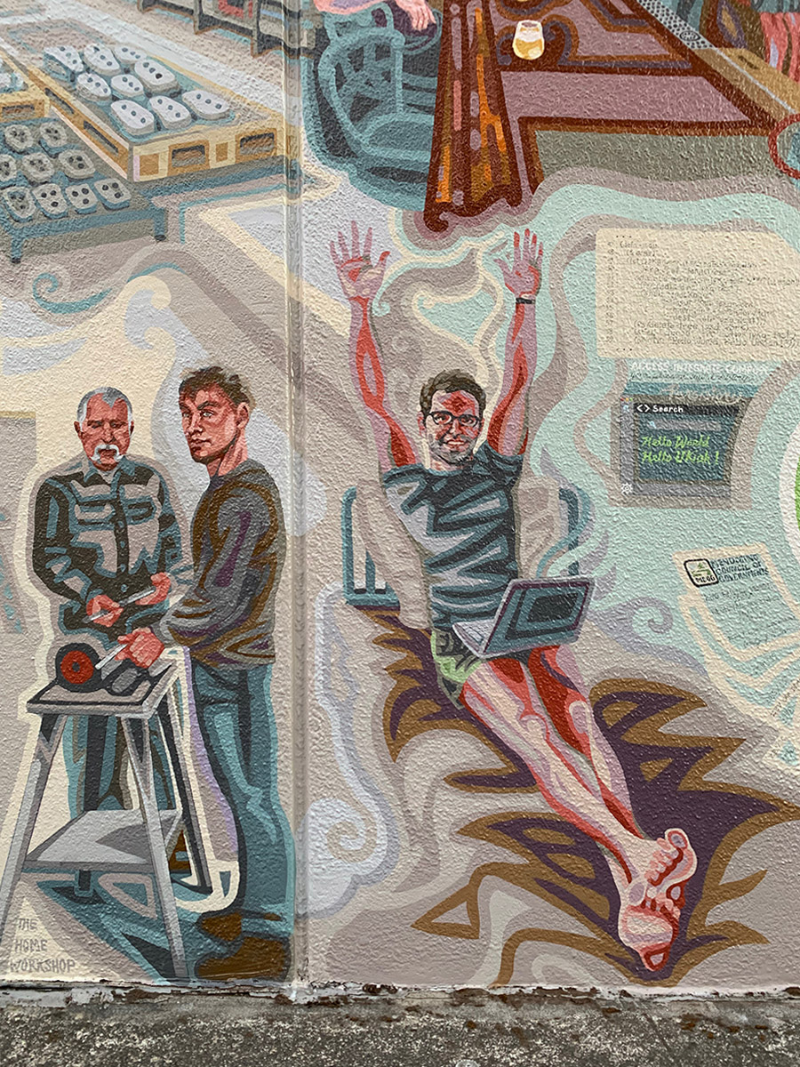 One last little note: Ian is painted right next to his brother Adrian in the manufacturing panel, both depicted doing great work from home!