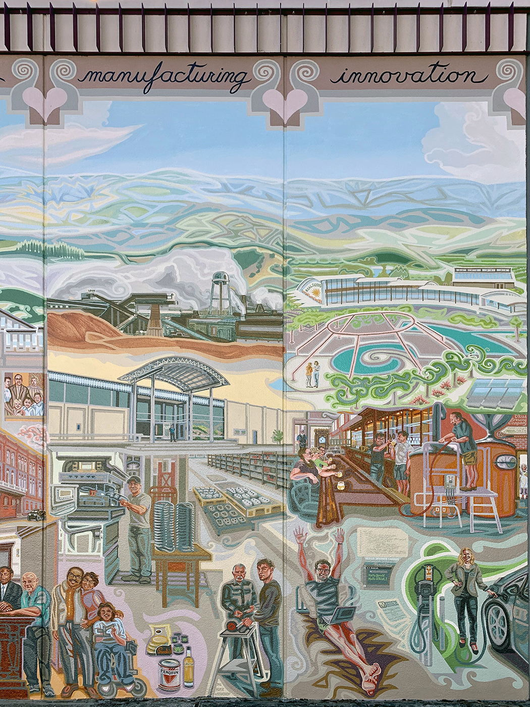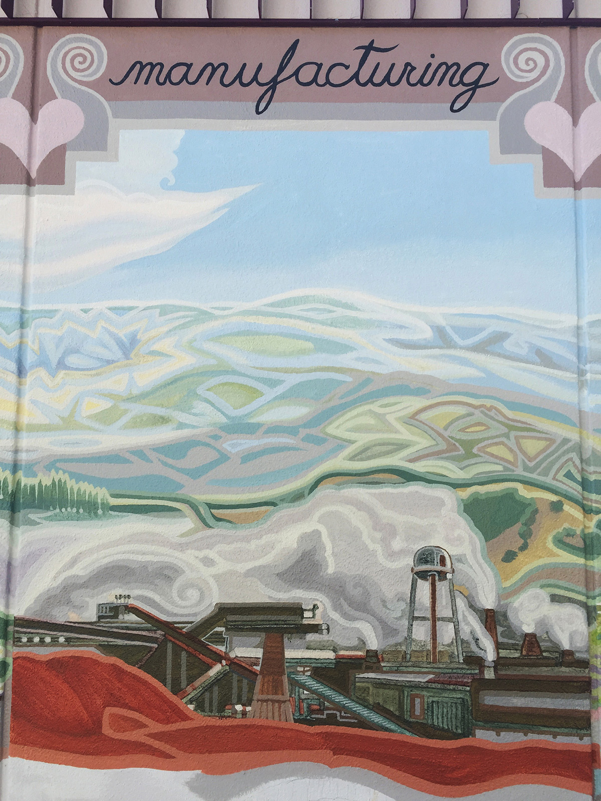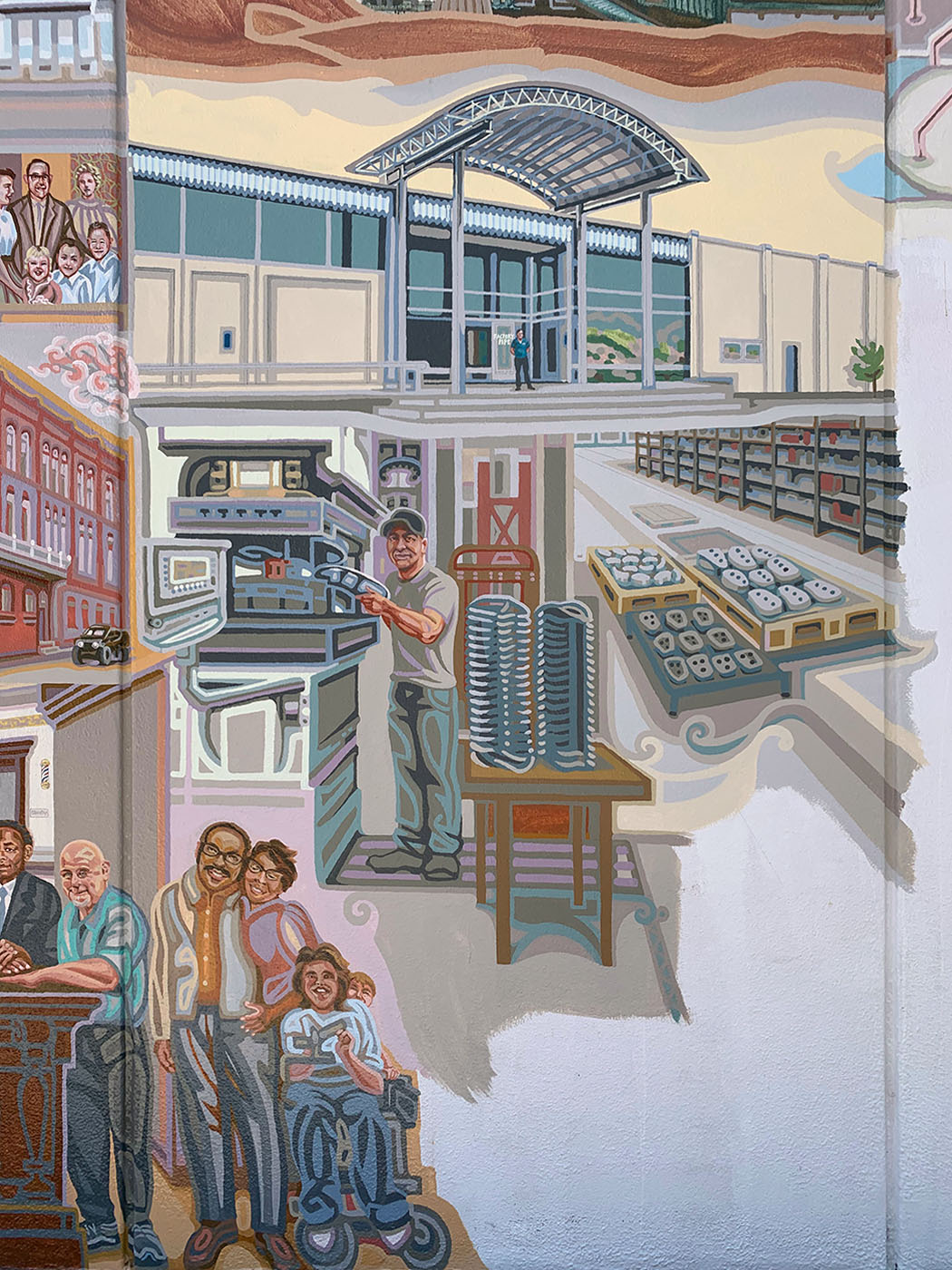 At the base of the panel I depicted a grouping of local products as well as a scene of two people making things in a home workshop.