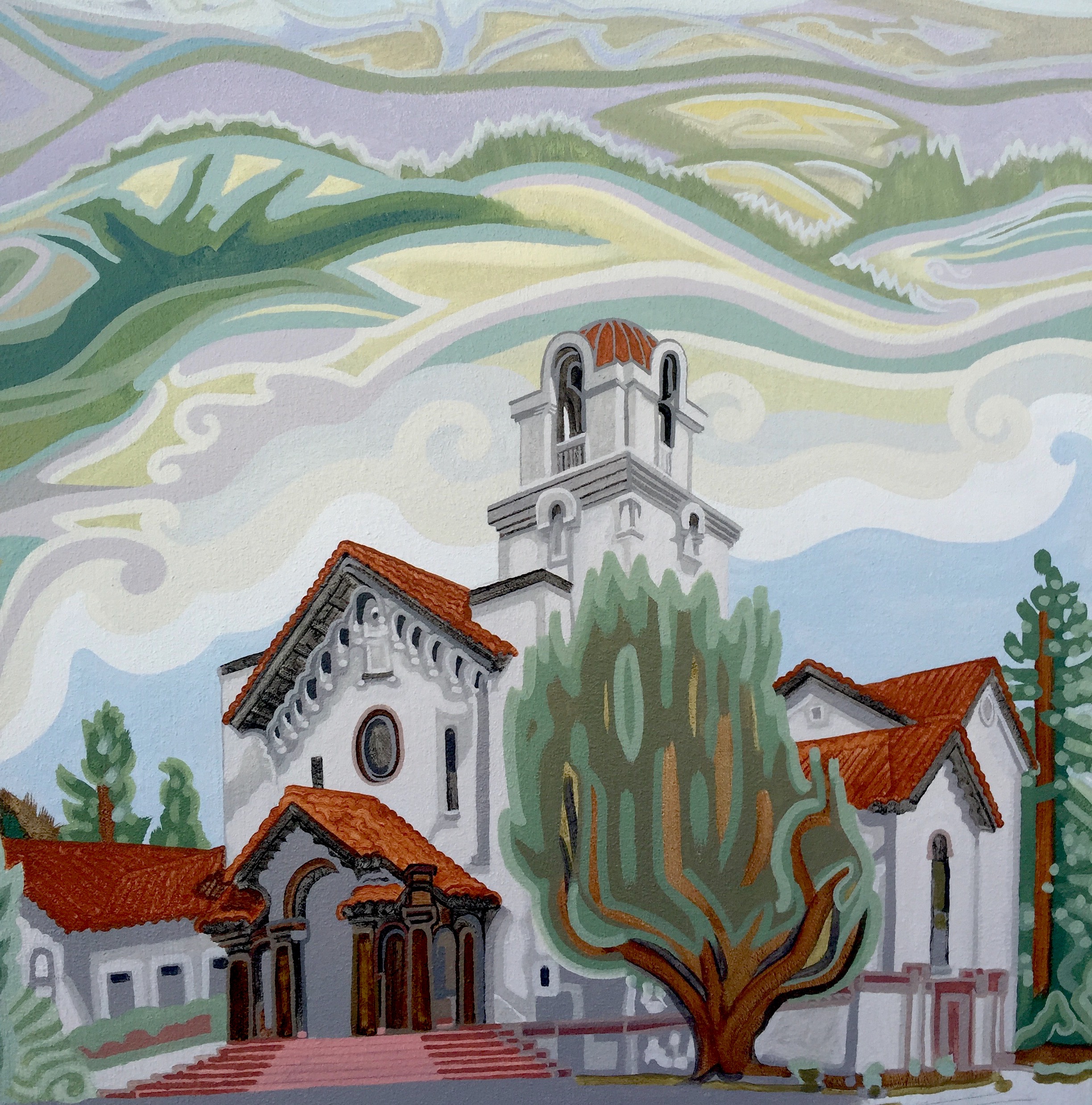 In this panel we again see the old and the new, this time embodied in the same structure: this Spanish-style edifice historically was Saint Mary of the Angels Catholic Church, and many people who saw the mural when I was working on this panel said, “Oh, we were married there!”