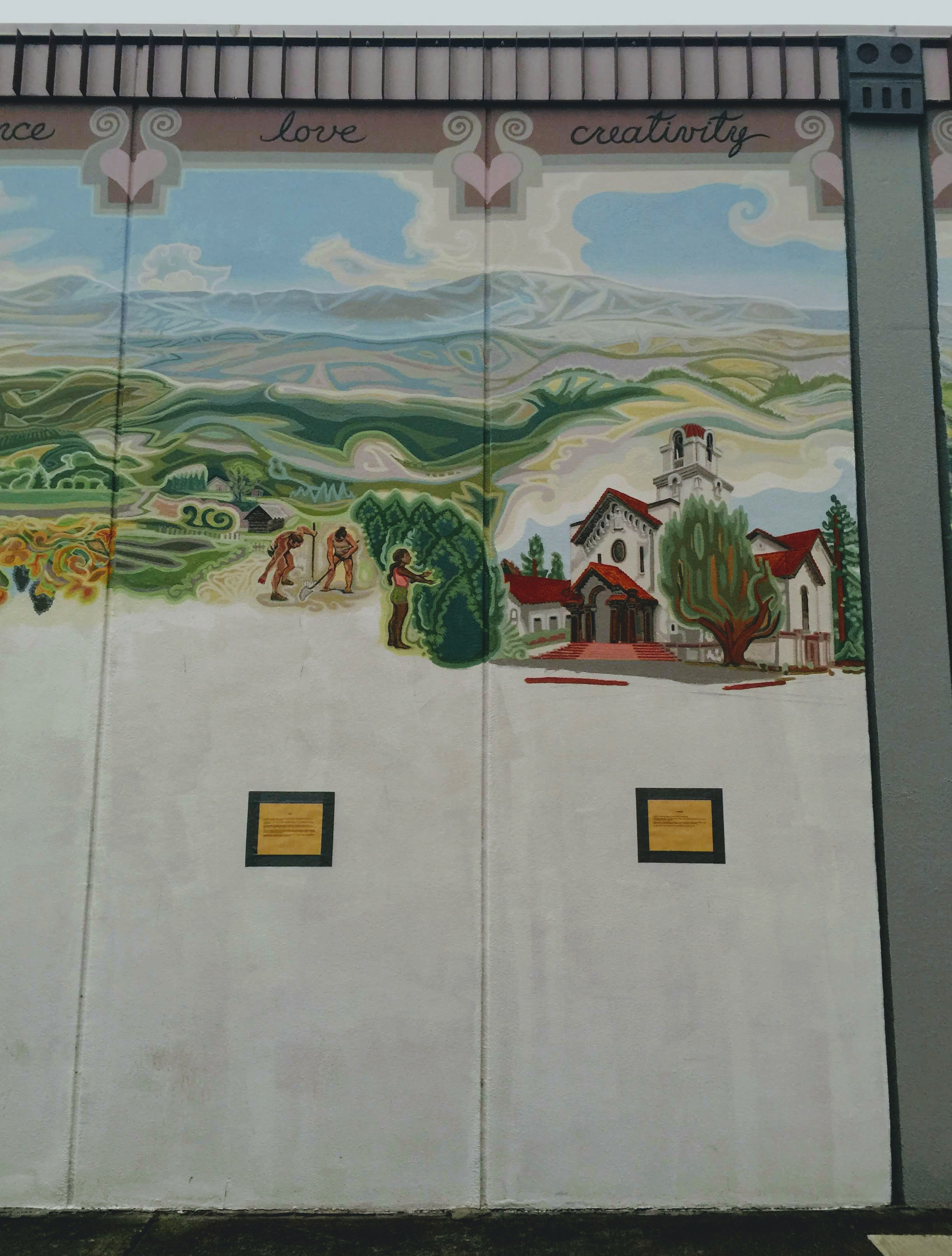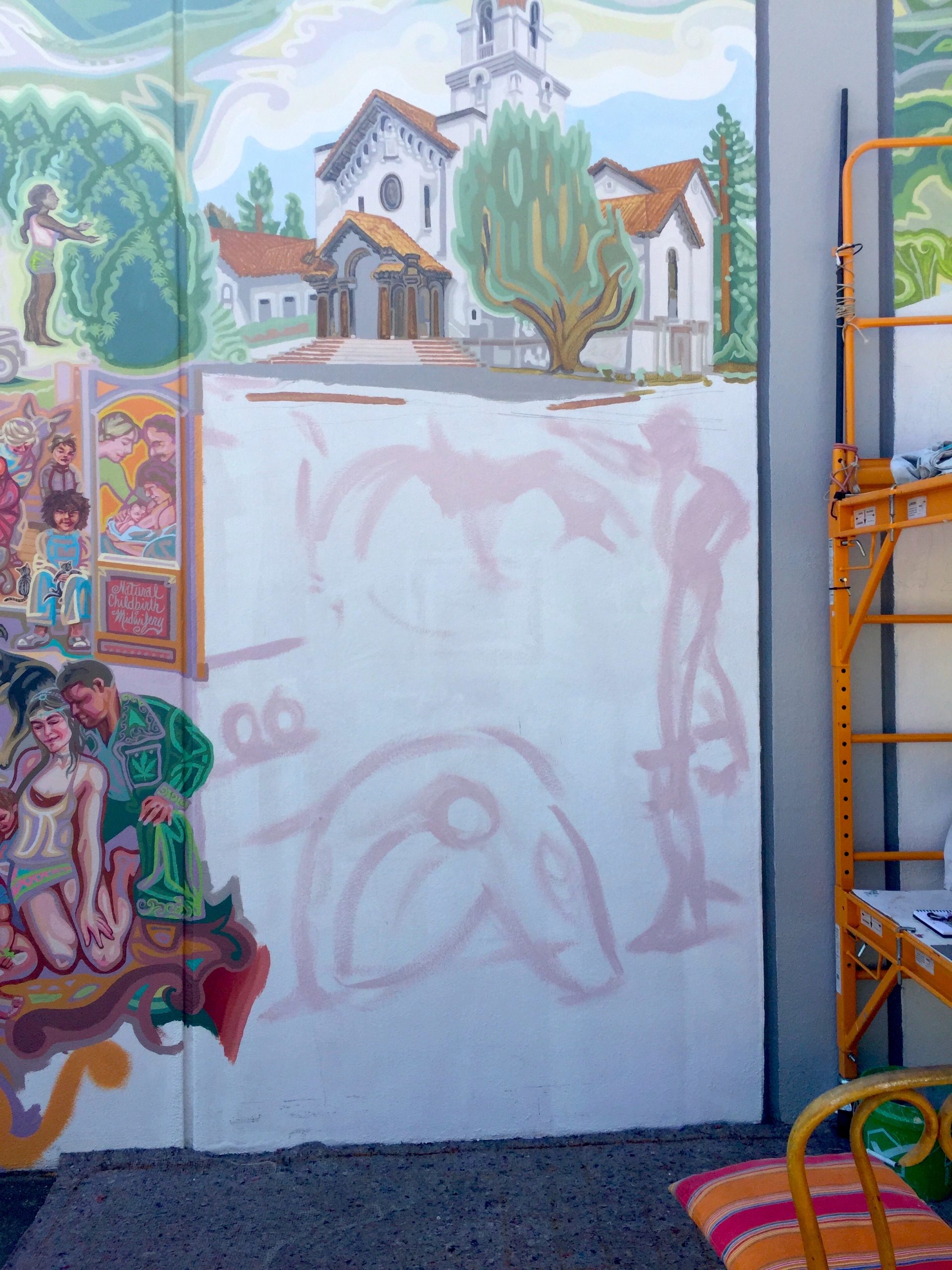 In this panel we again see the old and the new, this time embodied in the same structure: this Spanish-style edifice historically was Saint Mary of the Angels Catholic Church, and many people who saw the mural when I was working on this panel said, “Oh, we were married there!”