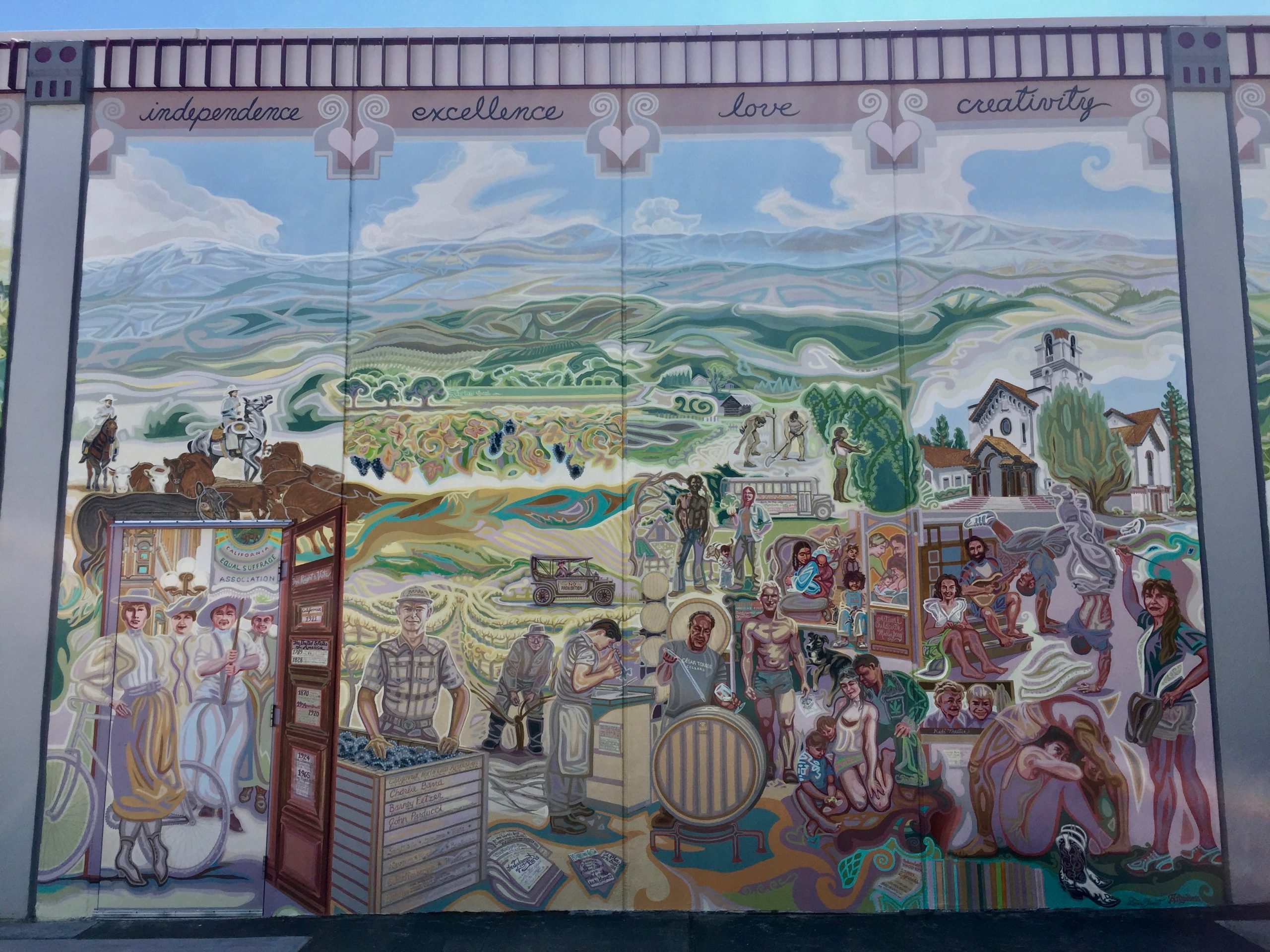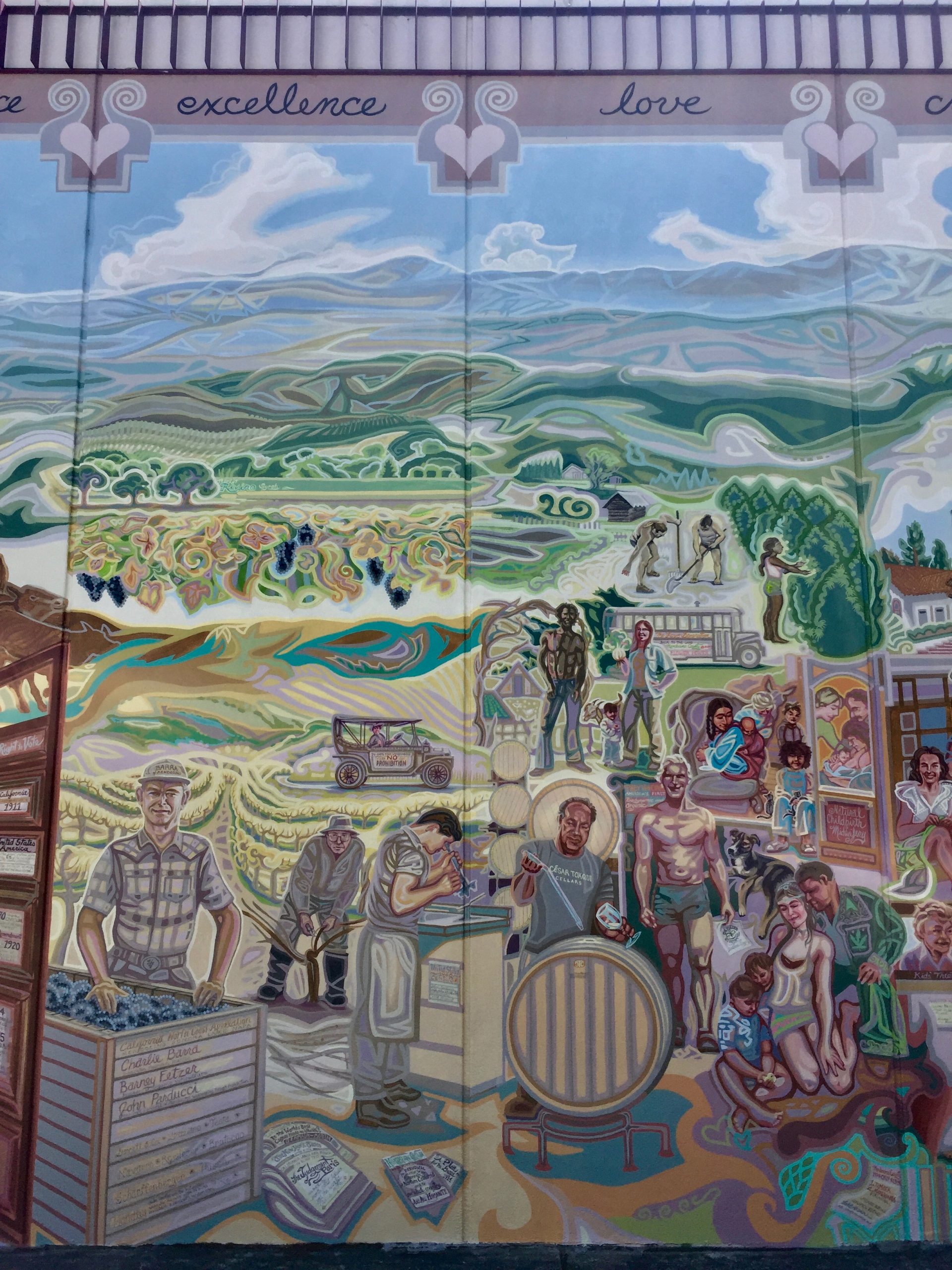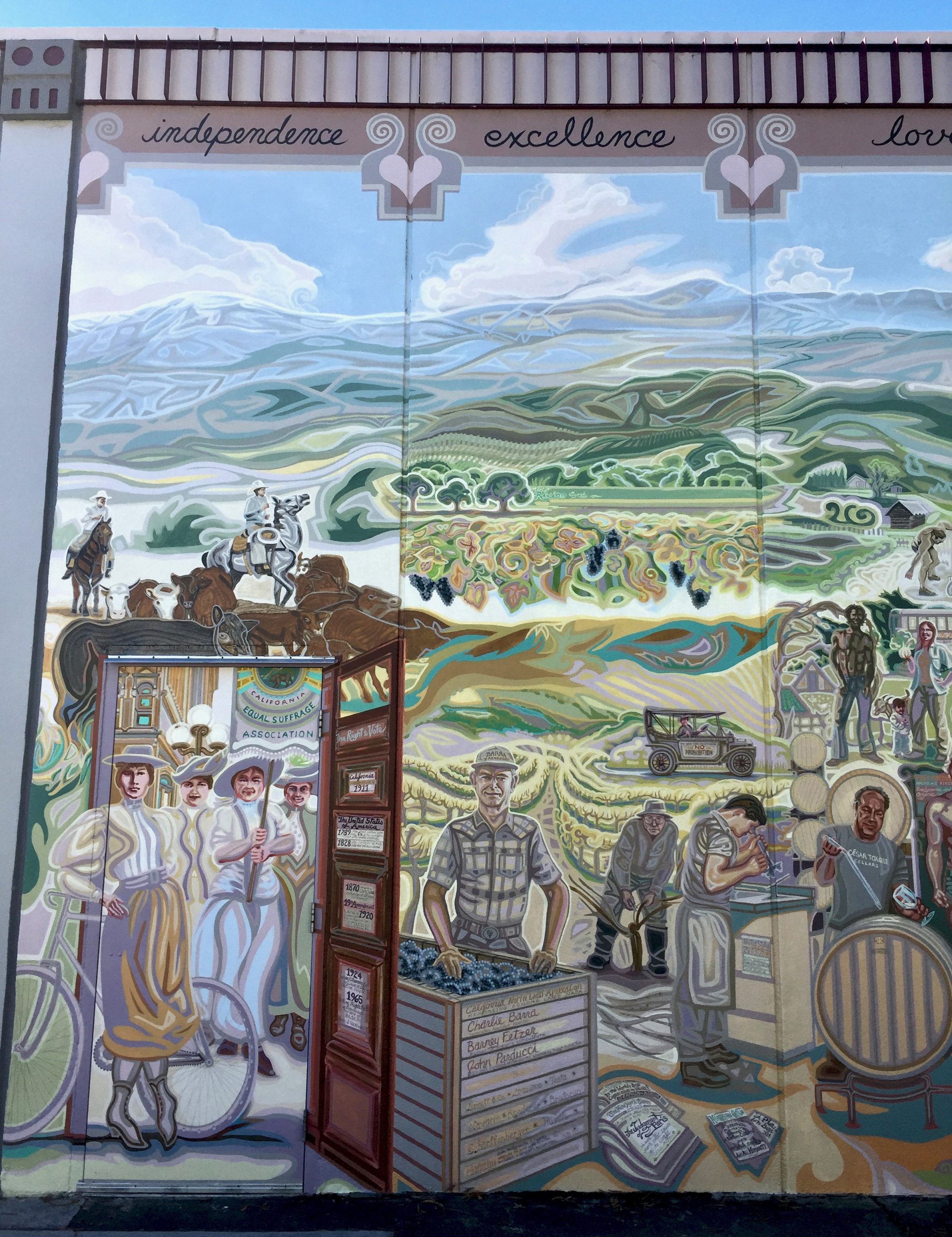 Three iconic wine pioneers are portrayed in the foreground: Charlie Barra, Barney Fetzer, and John Parducci. Notice the woman driving in her ’20s car behind them. This is Anna Morrison Reed, who was an influential suffragist, lecturer and publisher from Ukiah. She also campaigned against prohibition and in defense of the vineyards, uniting the themes of this panel and the previous one.