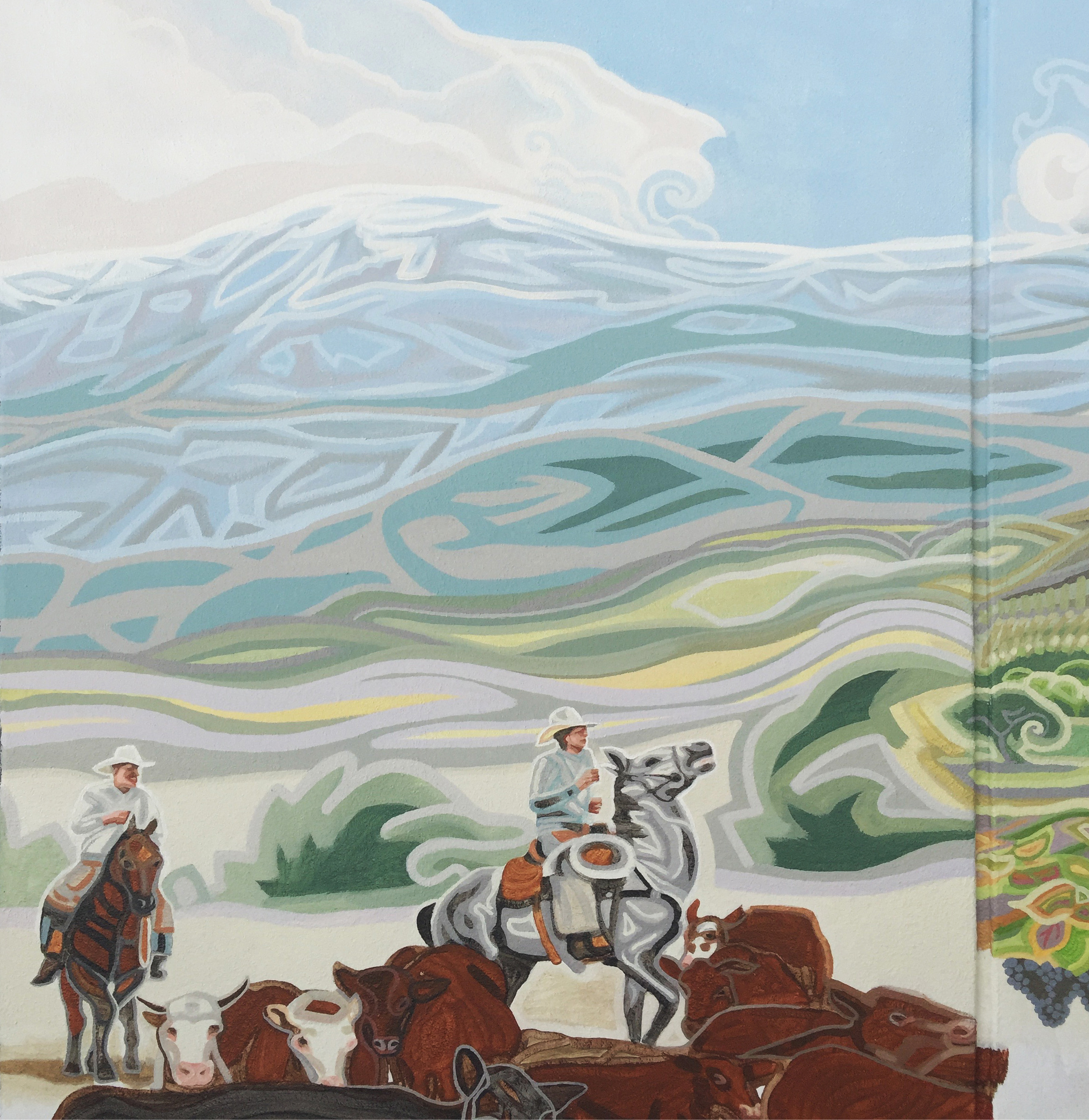 The upper part of the panel expresses independence in terms of the ranching life. Ranching continues to be important in our region, increasingly for local consumption of meat by a community that values self- sufficiency.
