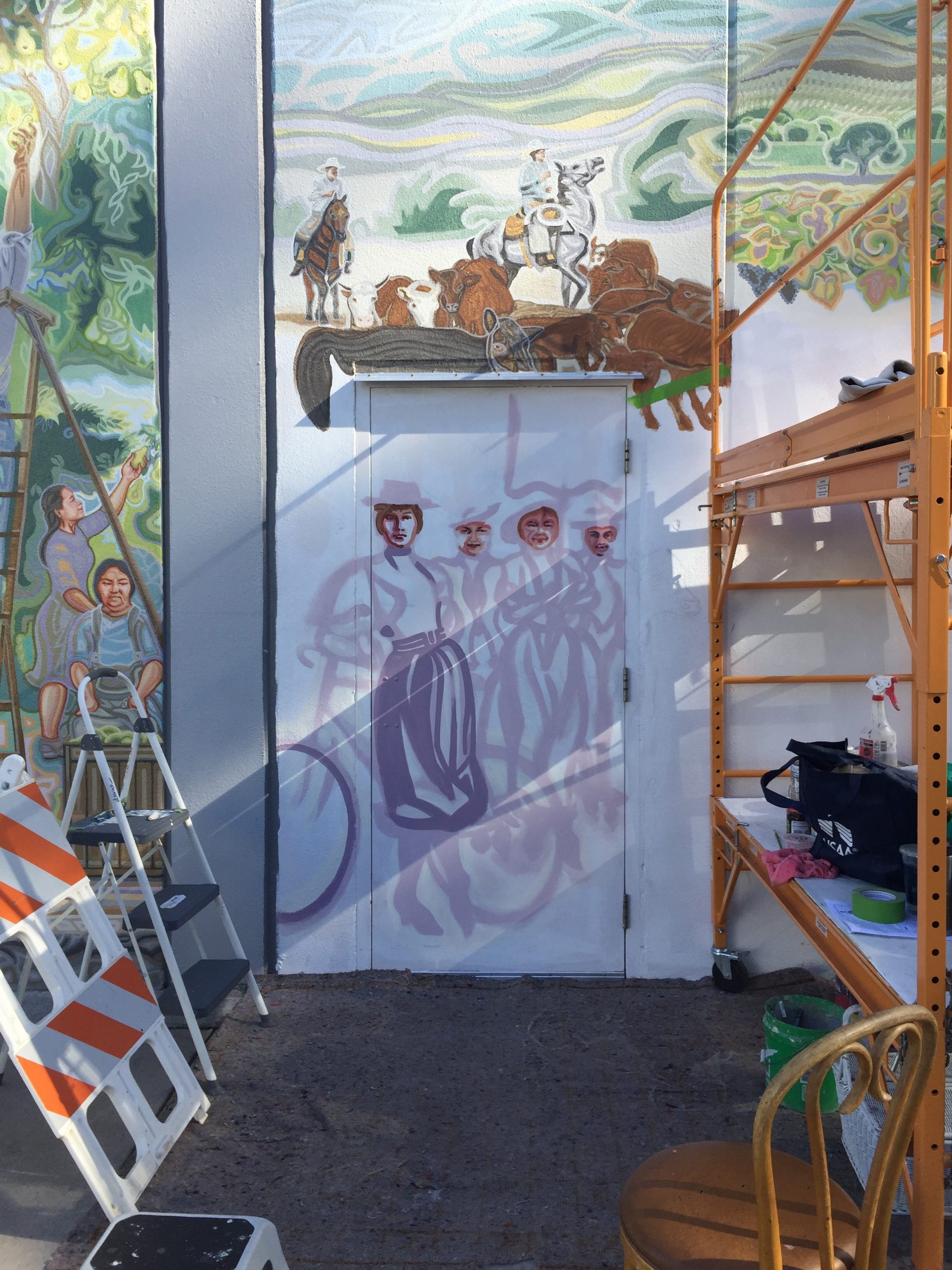 Then the idea struck me to use the utility door as part of the subject: independence achieved through the vote. 2020 is the 100-year anniversary of women’s suffrage in our country and I decided to show them walking through this open door of opportunity.