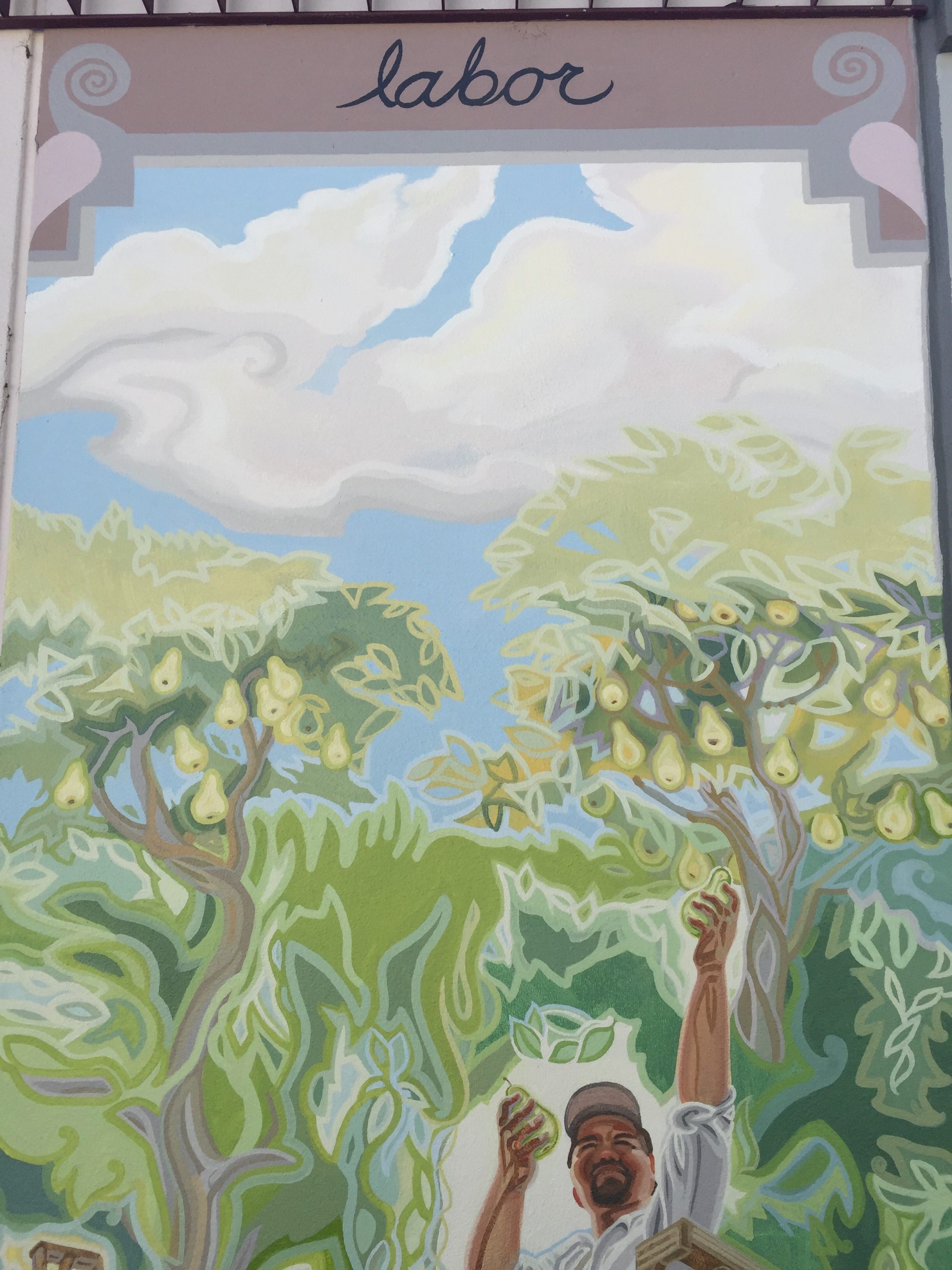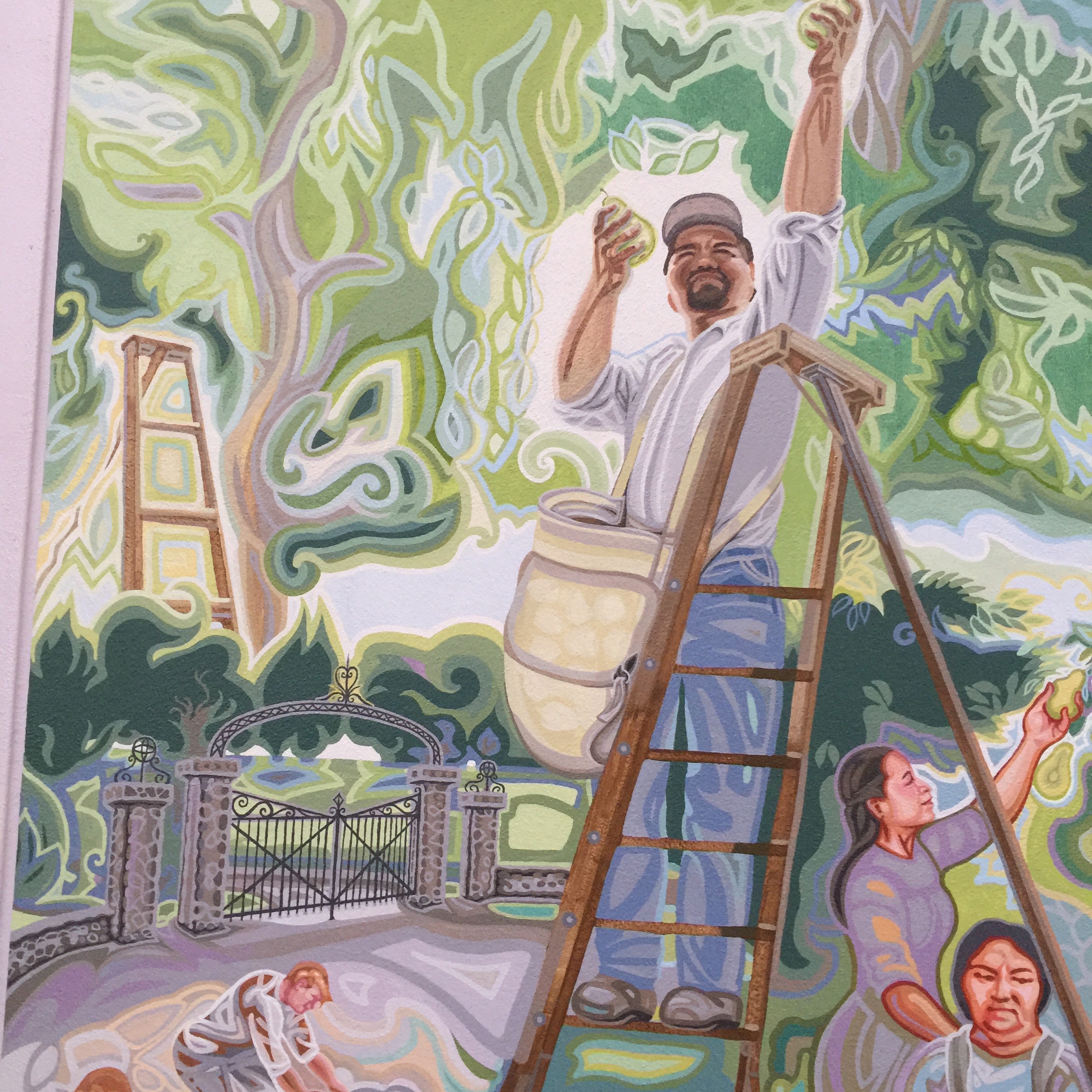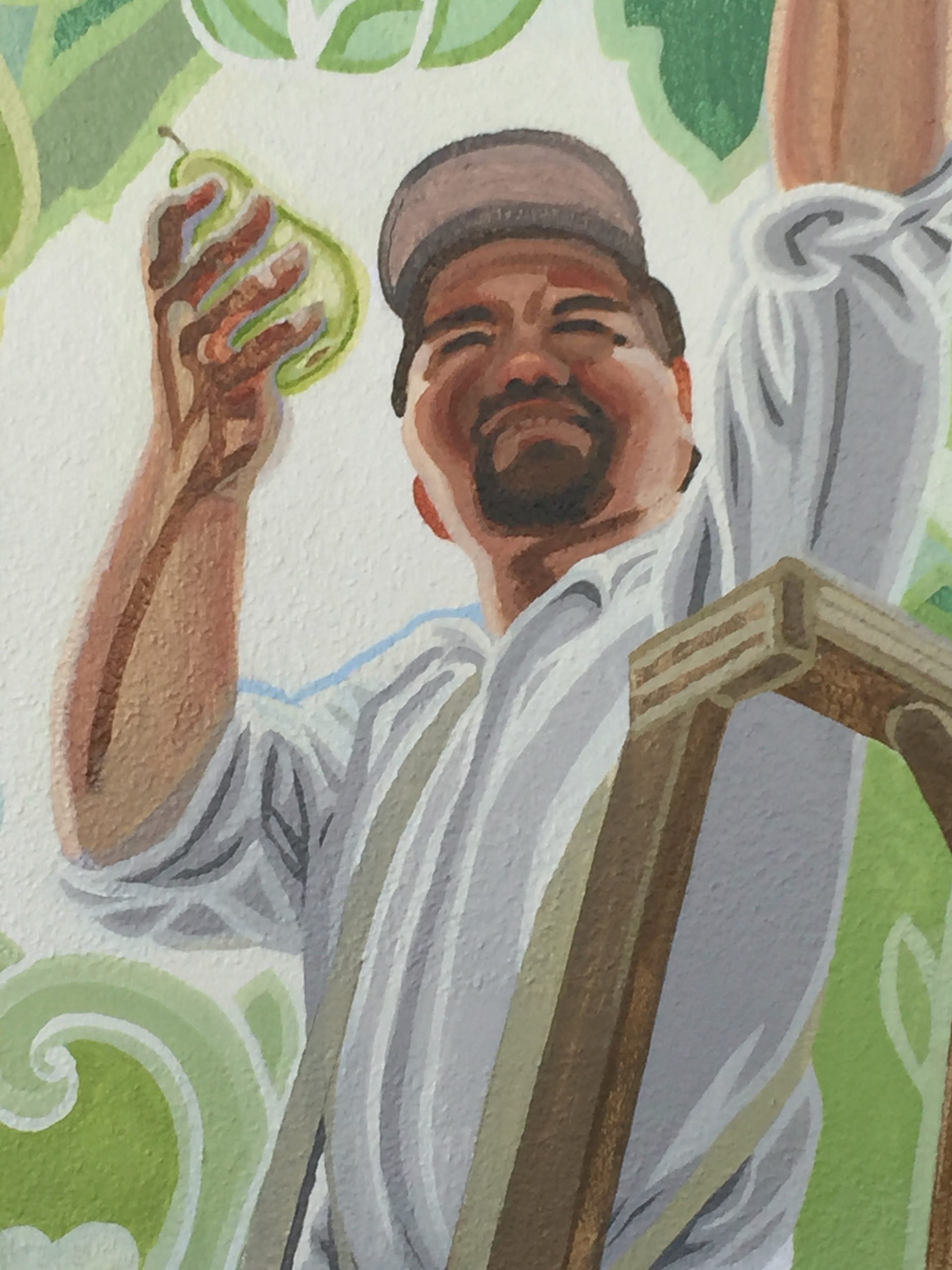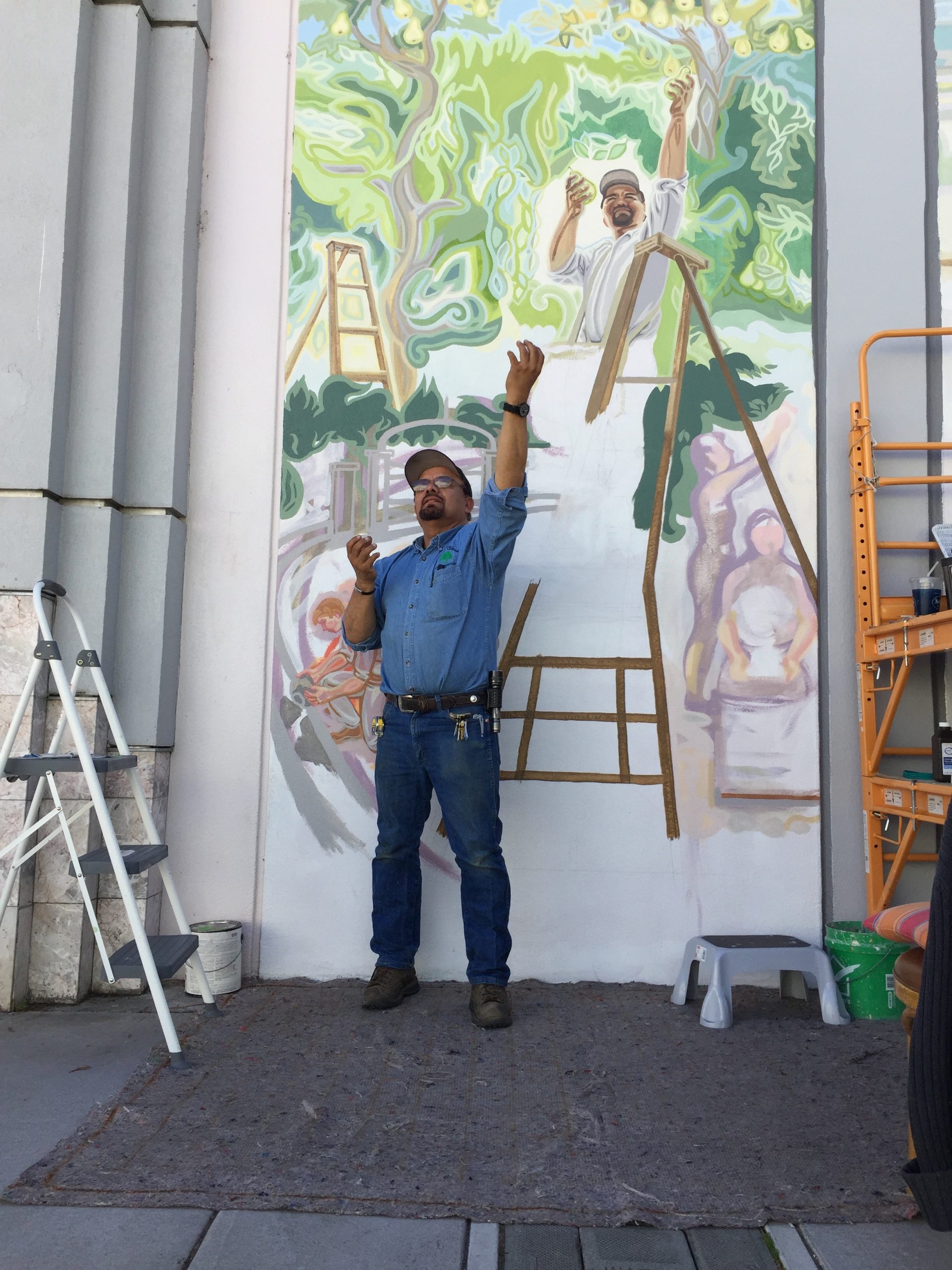 As I was painting the mural, I met many of the city employees who work at or come to the Conference Center frequently. One of these, José Ruiz, saw my planned subject matter and said he used to pick pears, a skill he learned from his grandfather. He became my advisor on this panel, instructing me in every aspect of pear harvesting and storage, the ladders used and the brilliantly designed canvas pouch that opens from the bottom so the pears can be carefully laid down in their collecting bin and the bag simply slid away. He also agreed to model!