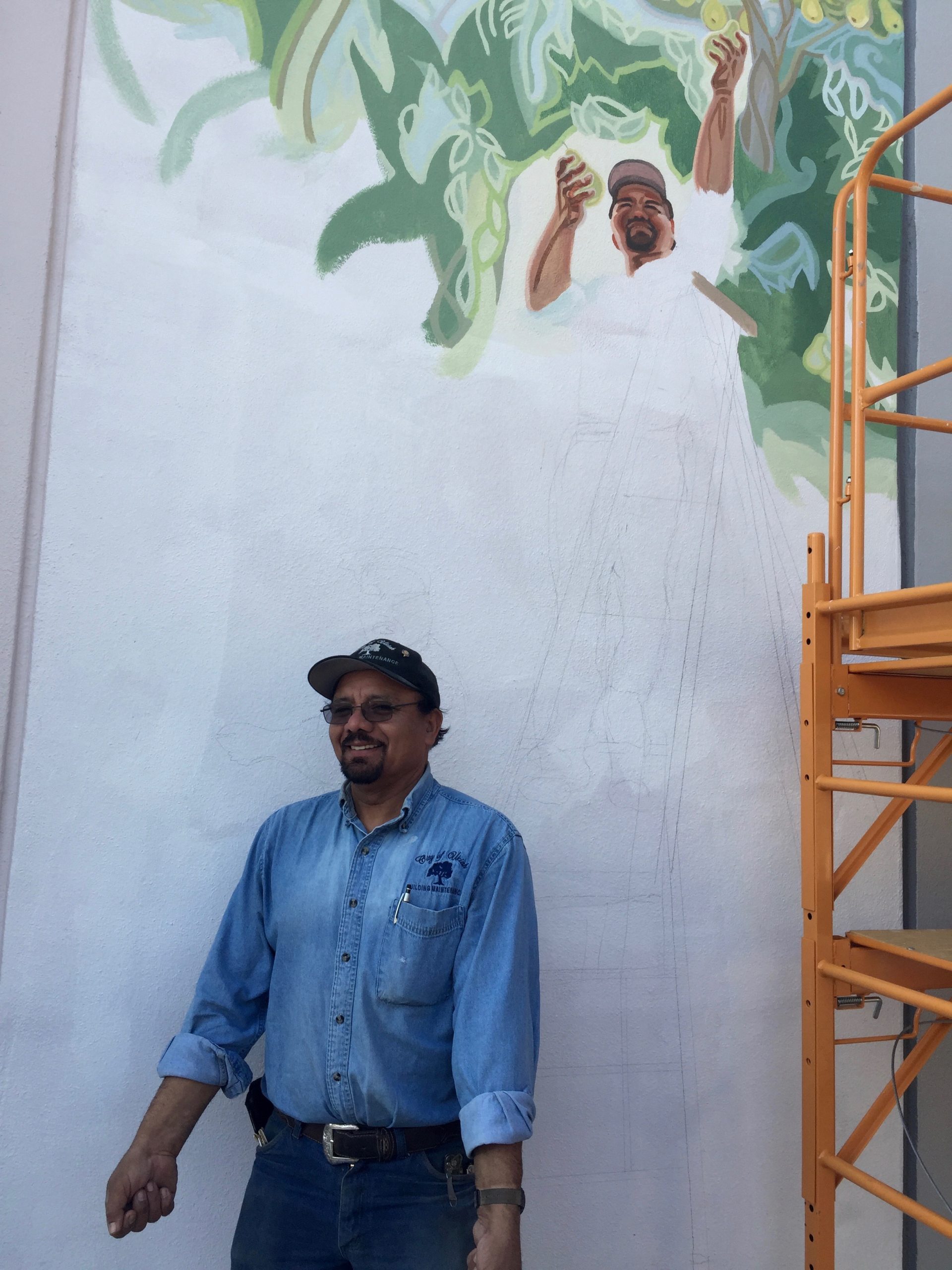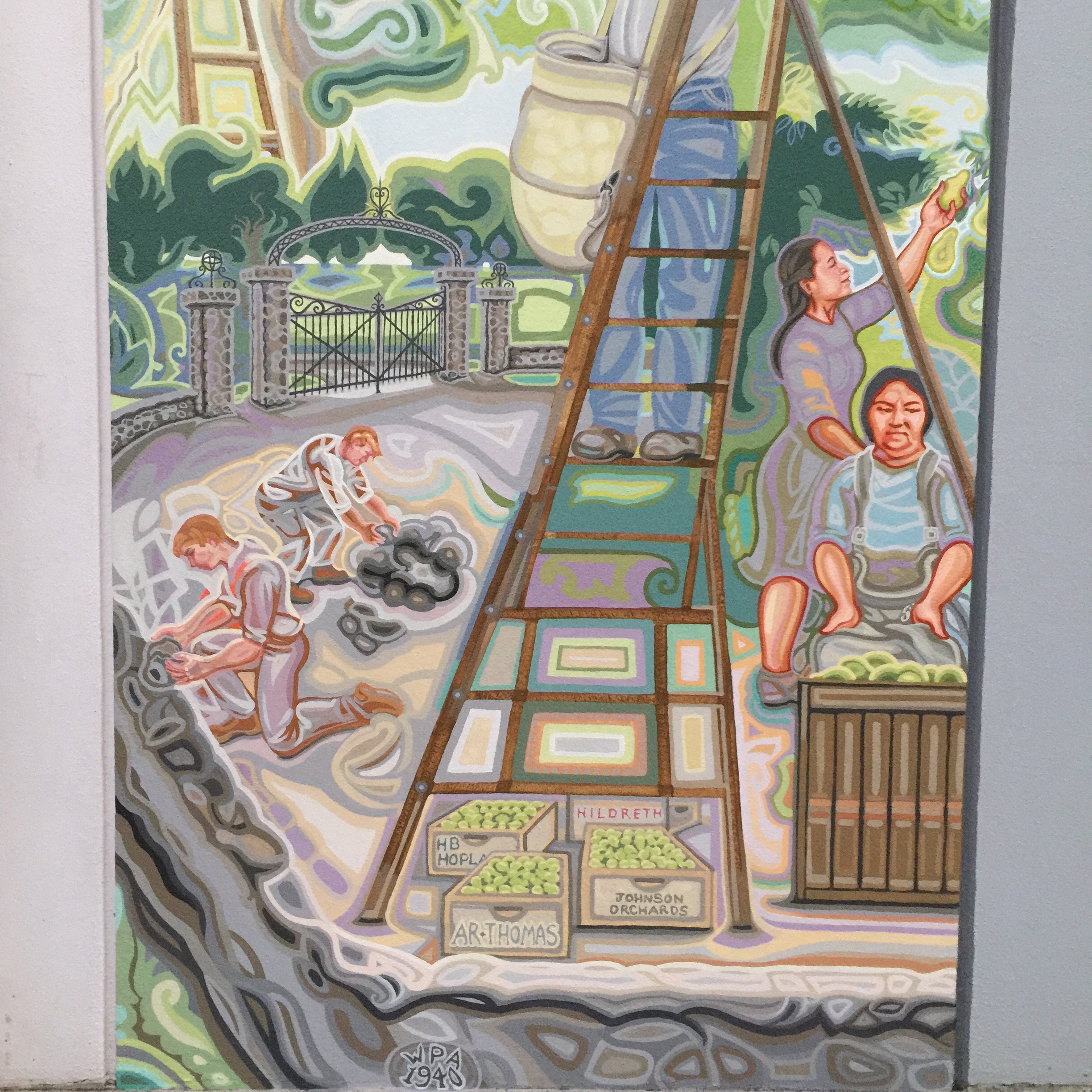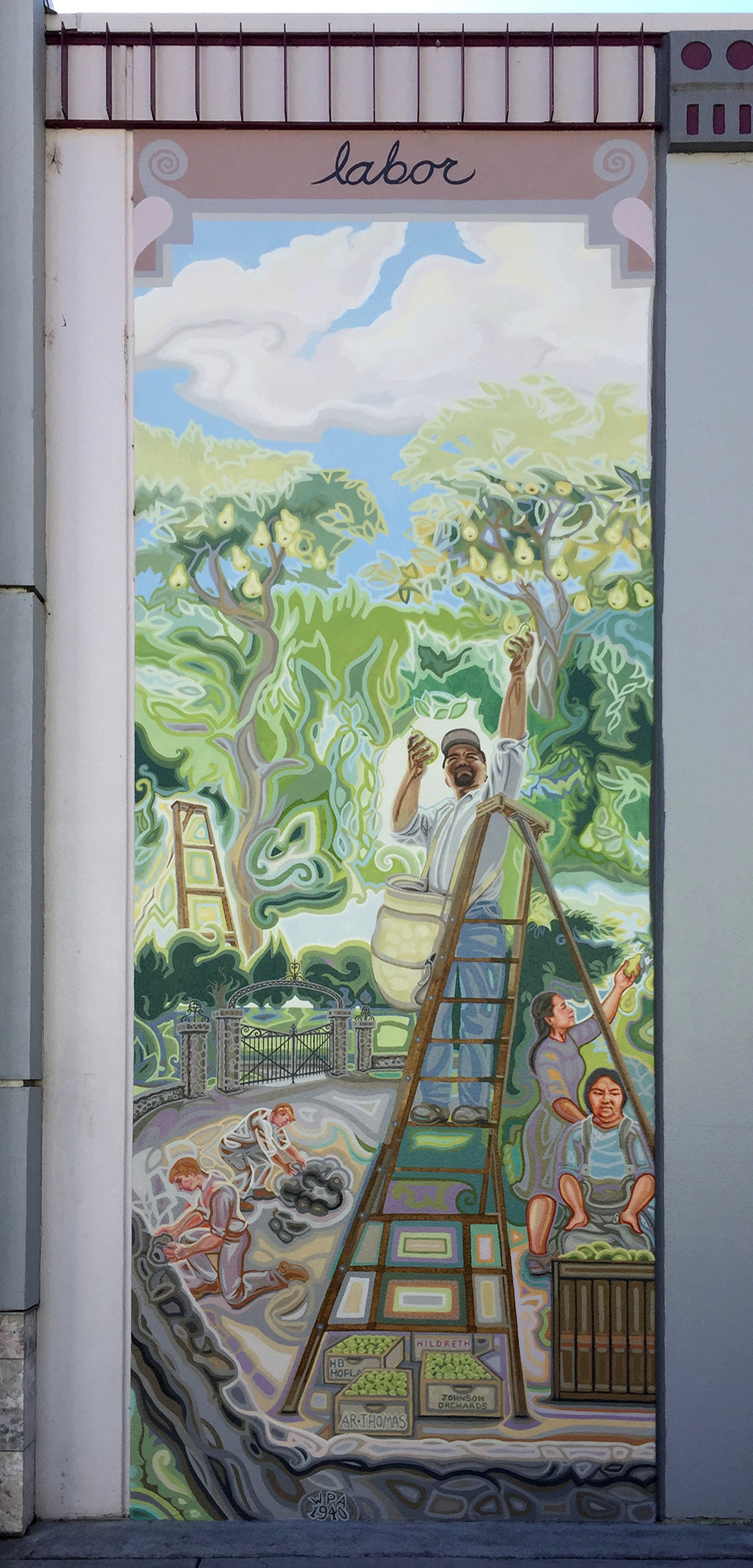 As I was painting the mural, I met many of the city employees who work at or come to the Conference Center frequently. One of these, José Ruiz, saw my planned subject matter and said he used to pick pears, a skill he learned from his grandfather. He became my advisor on this panel, instructing me in every aspect of pear harvesting and storage, the ladders used and the brilliantly designed canvas pouch that opens from the bottom so the pears can be carefully laid down in their collecting bin and the bag simply slid away. He also agreed to model!