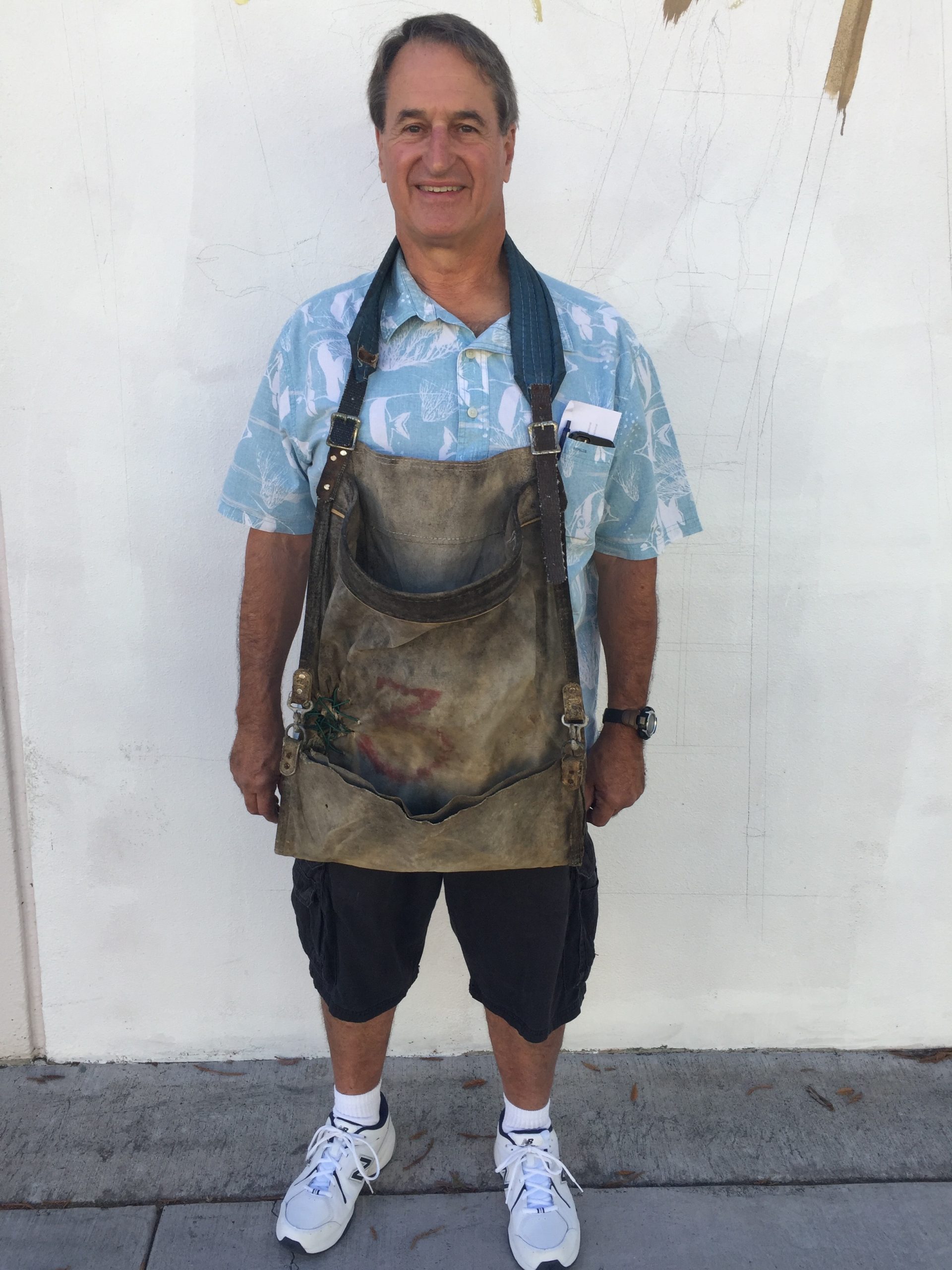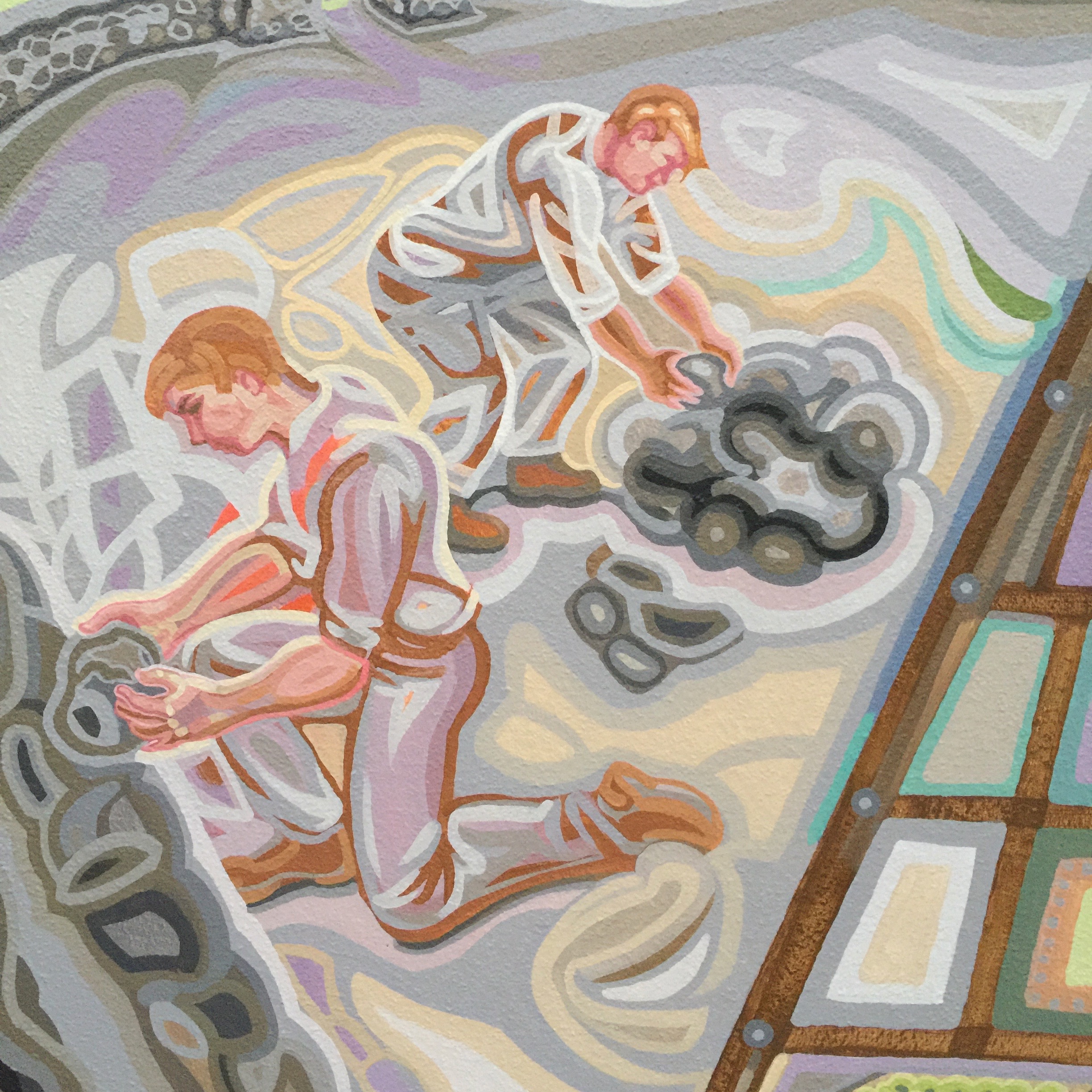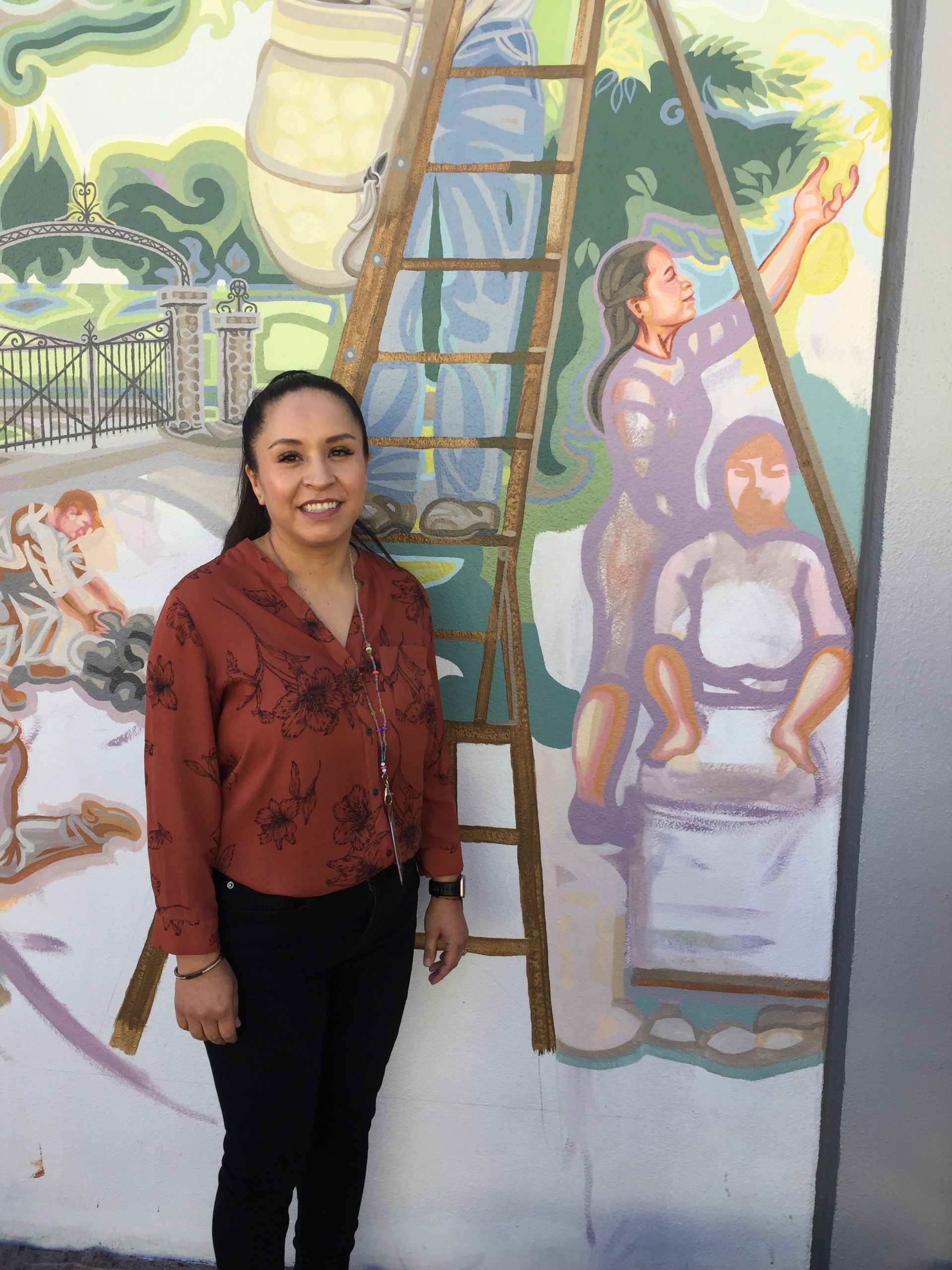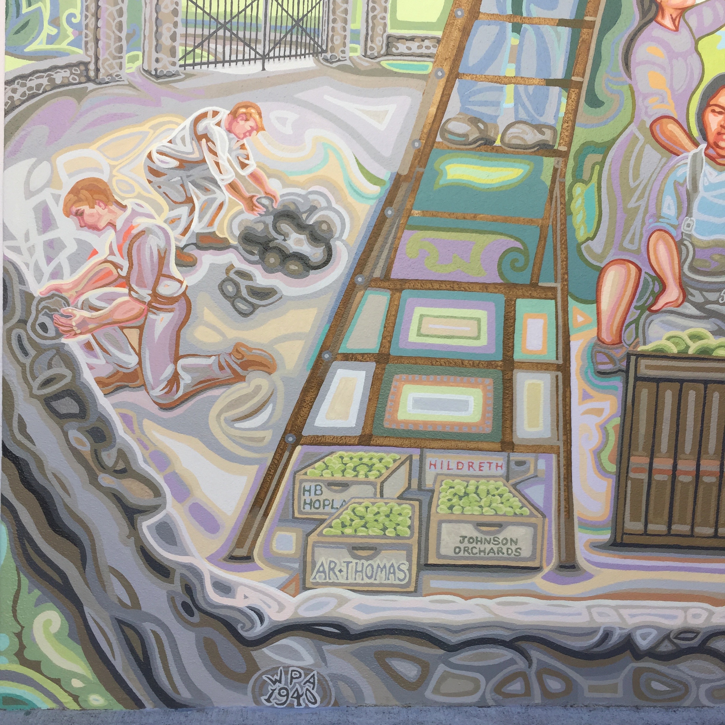 As I was painting the mural, I met many of the city employees who work at or come to the Conference Center frequently. One of these, José Ruiz, saw my planned subject matter and said he used to pick pears, a skill he learned from his grandfather. He became my advisor on this panel, instructing me in every aspect of pear harvesting and storage, the ladders used and the brilliantly designed canvas pouch that opens from the bottom so the pears can be carefully laid down in their collecting bin and the bag simply slid away. He also agreed to model!