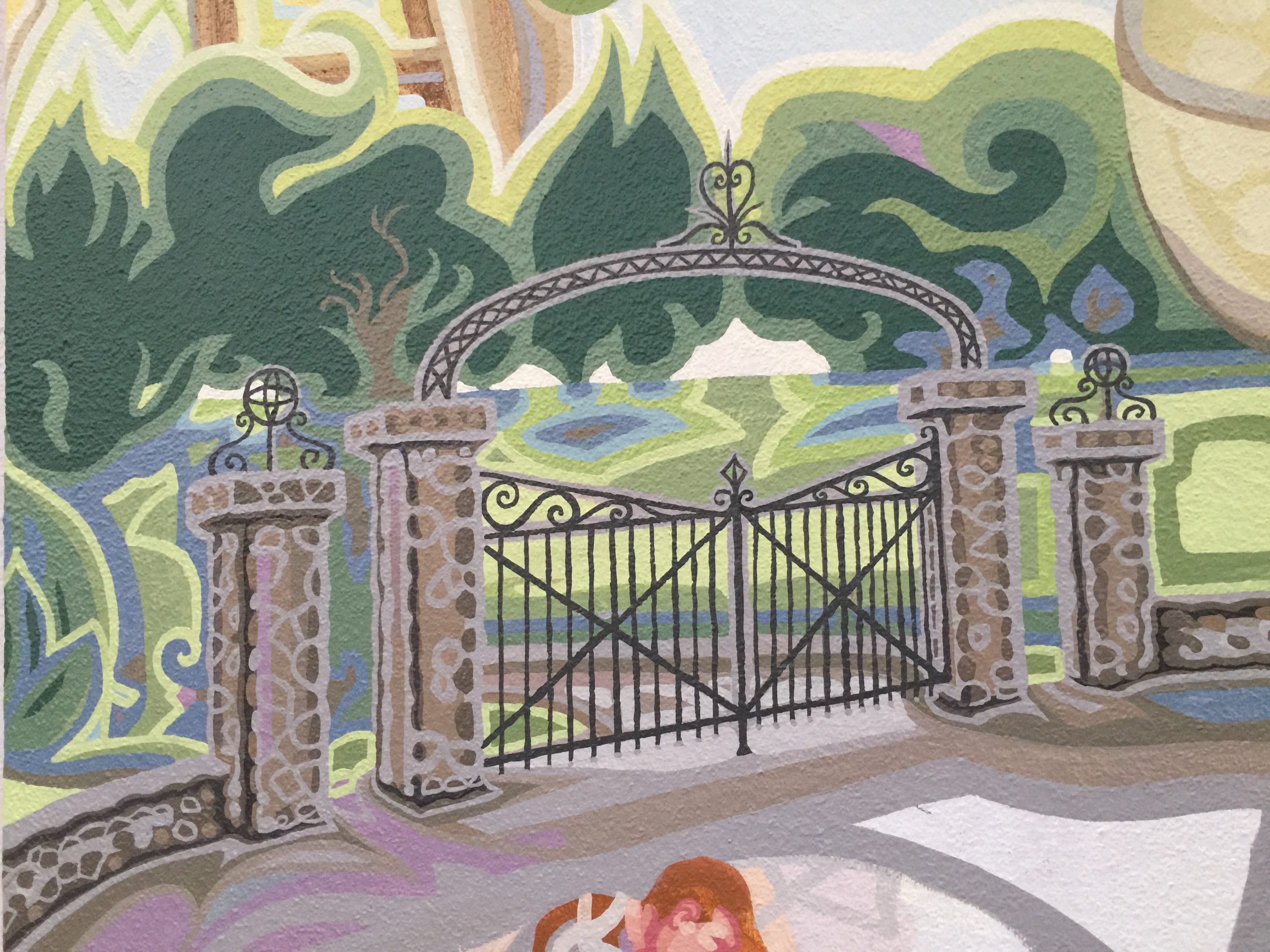 The remainder of the labor panel, which honors all the work we do with our bodies and hands, shows the 1940 WPA project consisting of the low stone wall built around Todd Grove Park and its accompanying beautiful wrought iron gate.