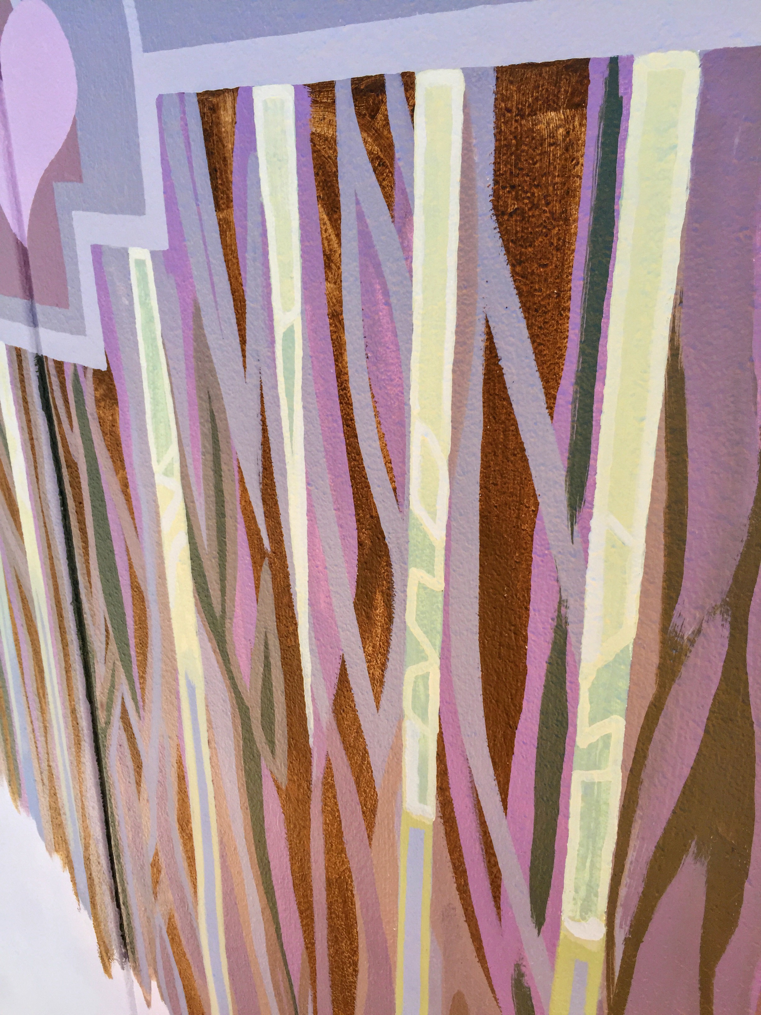 I use the tape to block out the vertical gaps between trunks. Then I am free to paint the bark of the trunks with huge strokes. After pulling away the tape I can paint luminosity between the trees.