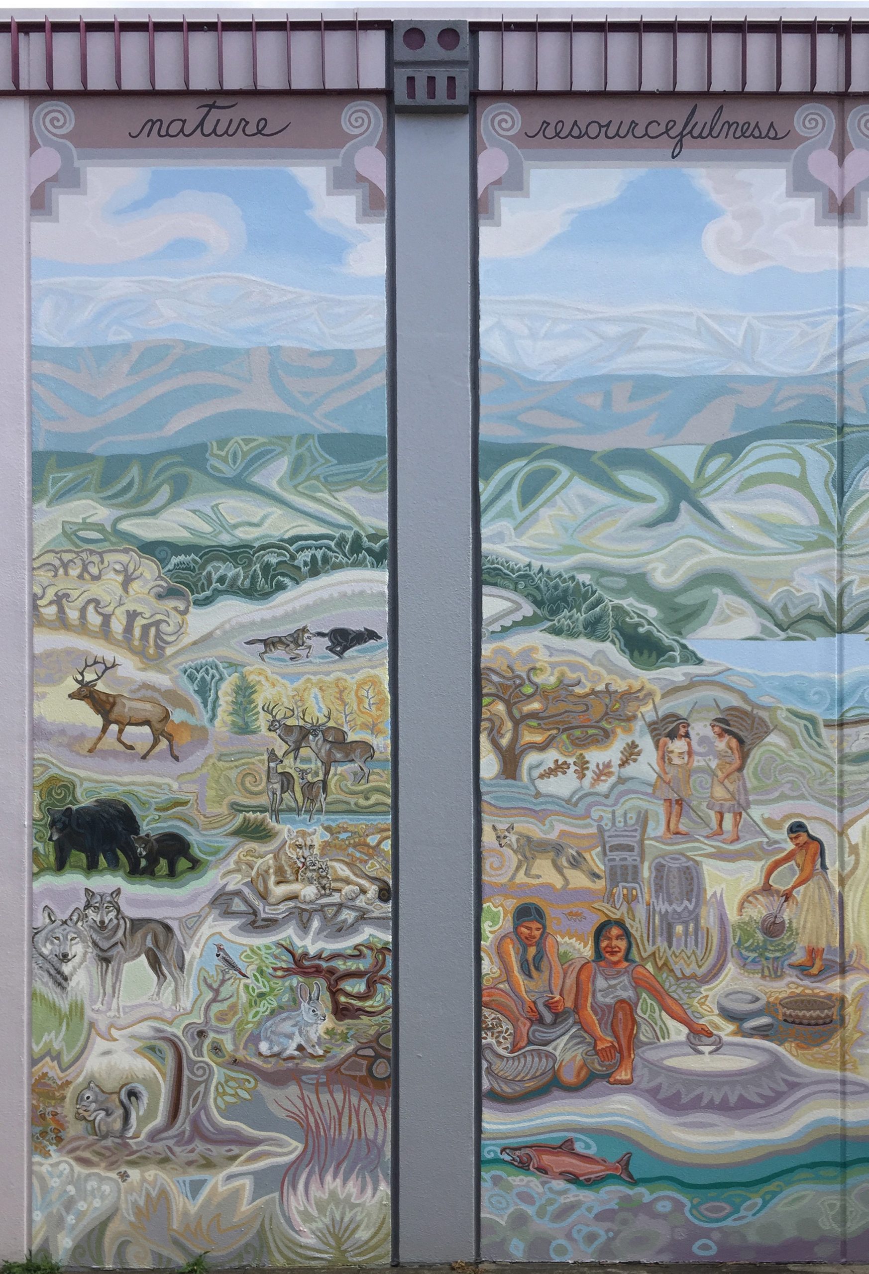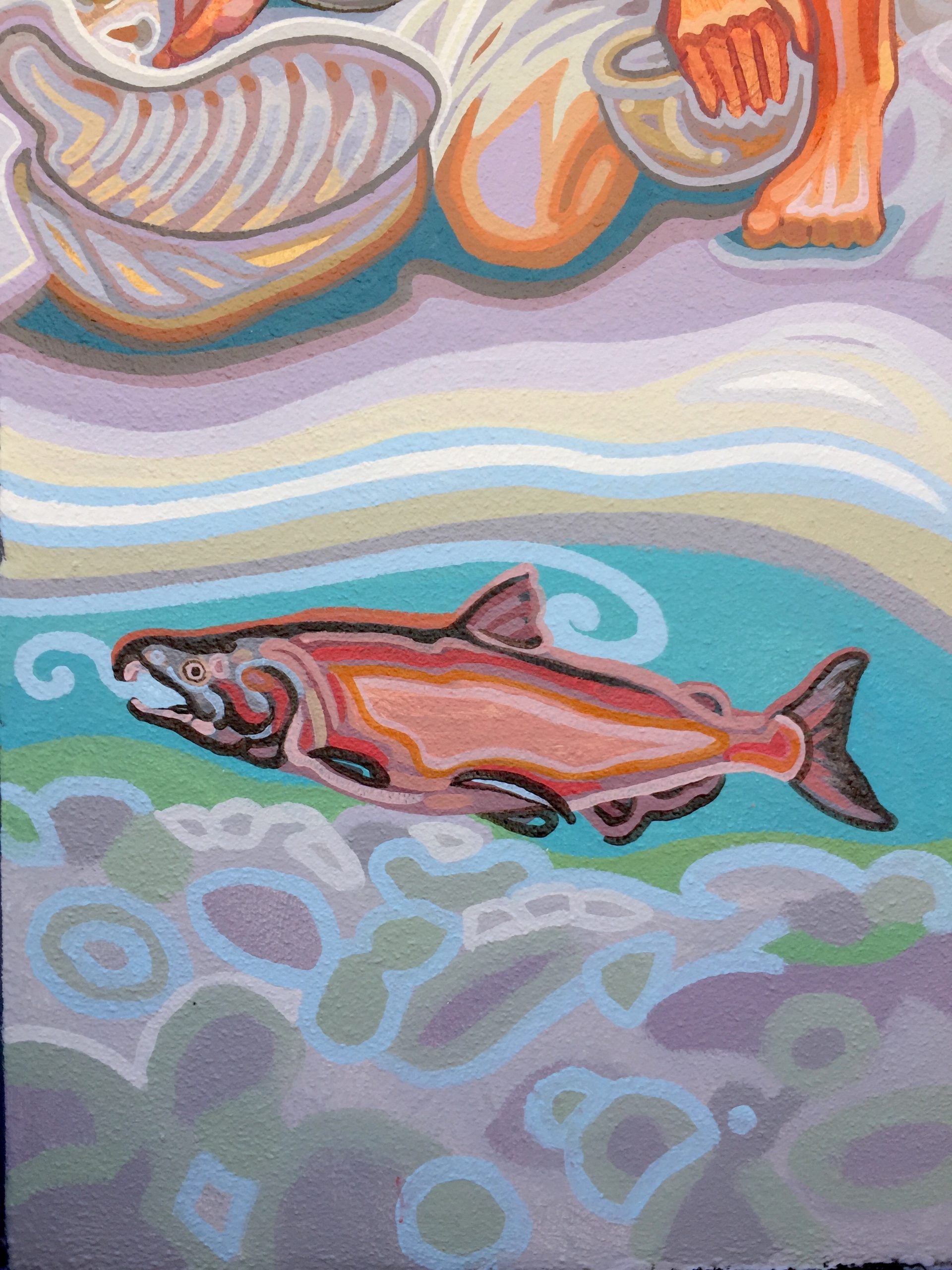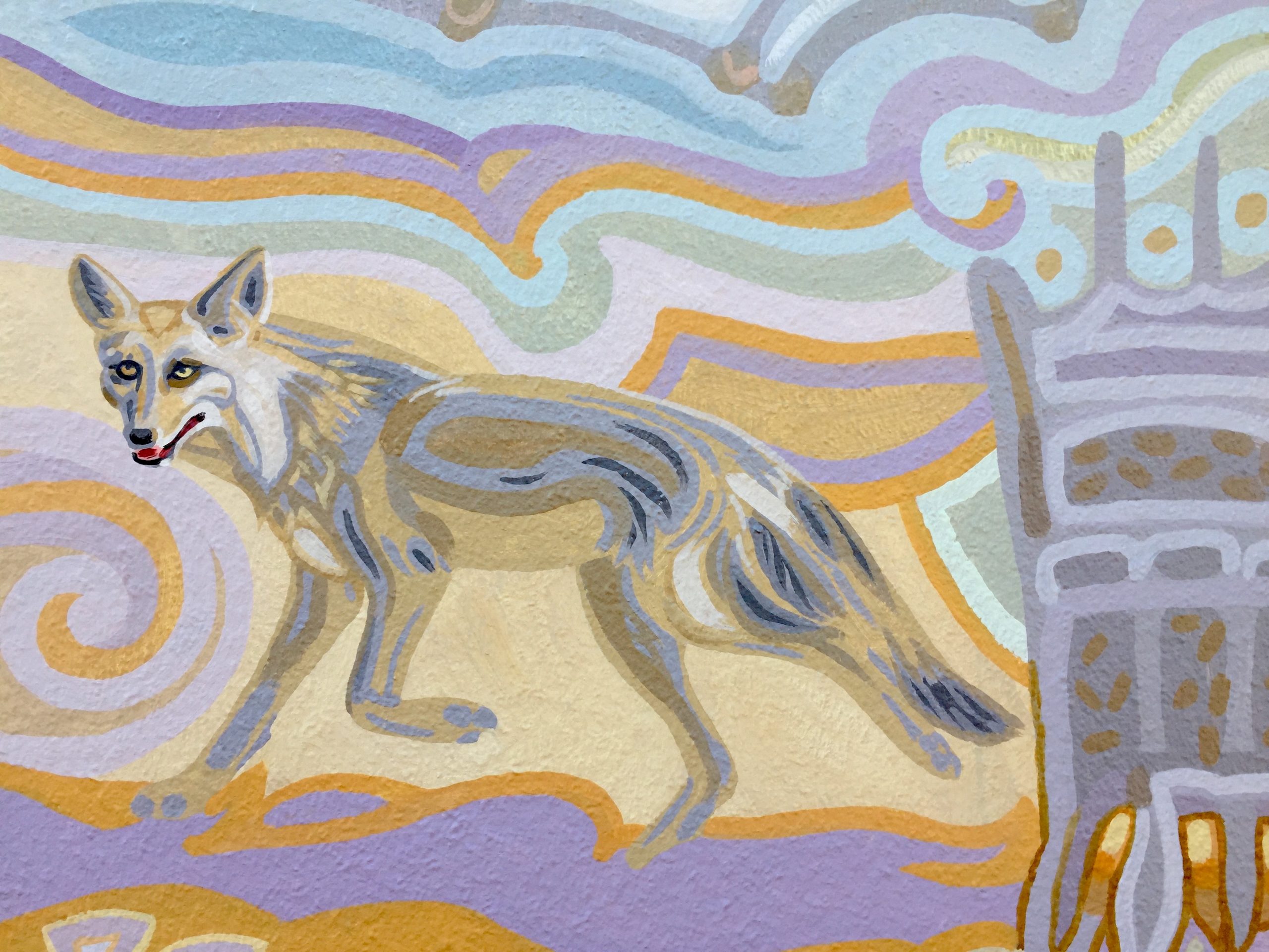 Animals interact with humans and nourish them, represented by a spawning salmon swimming up stream. In Pomo culture, Coyote is the trickster figure, both good and evil, crafty and foolish. Coyote stories have moral meaning and were told only in winter.*