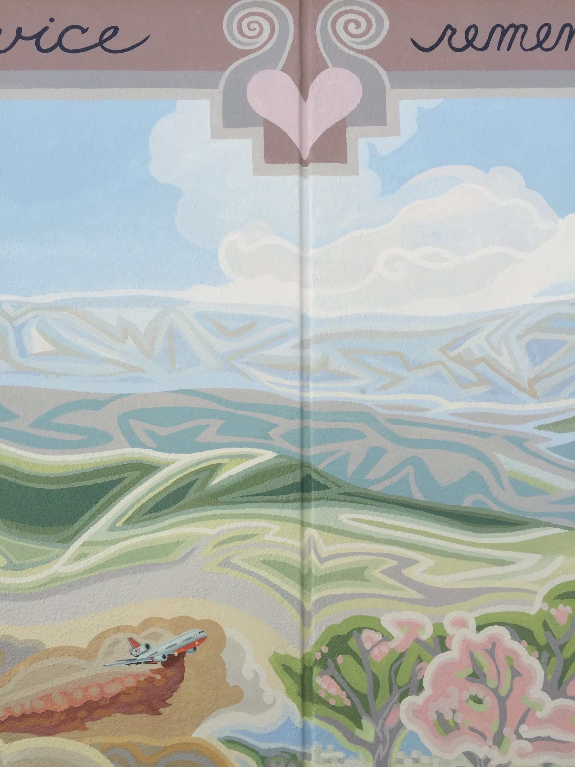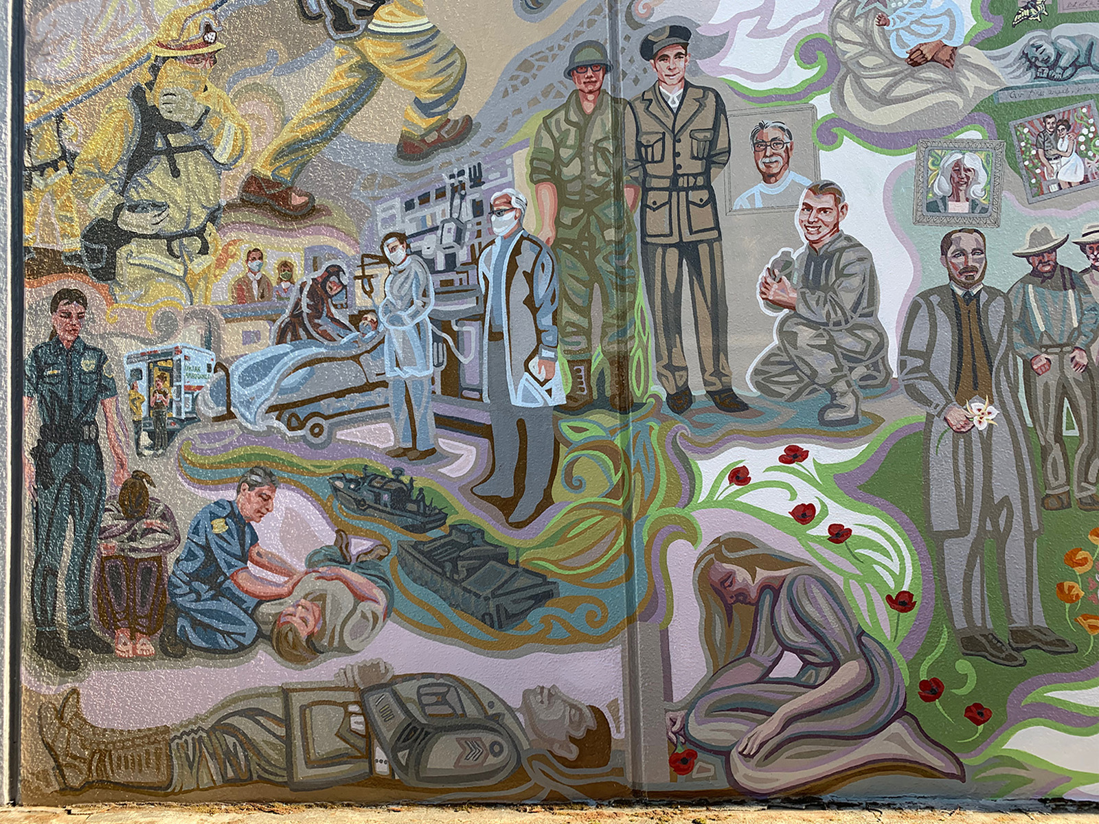 The lives of local family members have been tragically cut short by the pandemic, increasing fires, and of course during military service in conflicts past and present. It is meaningful that the adjoining panel is remembrance.