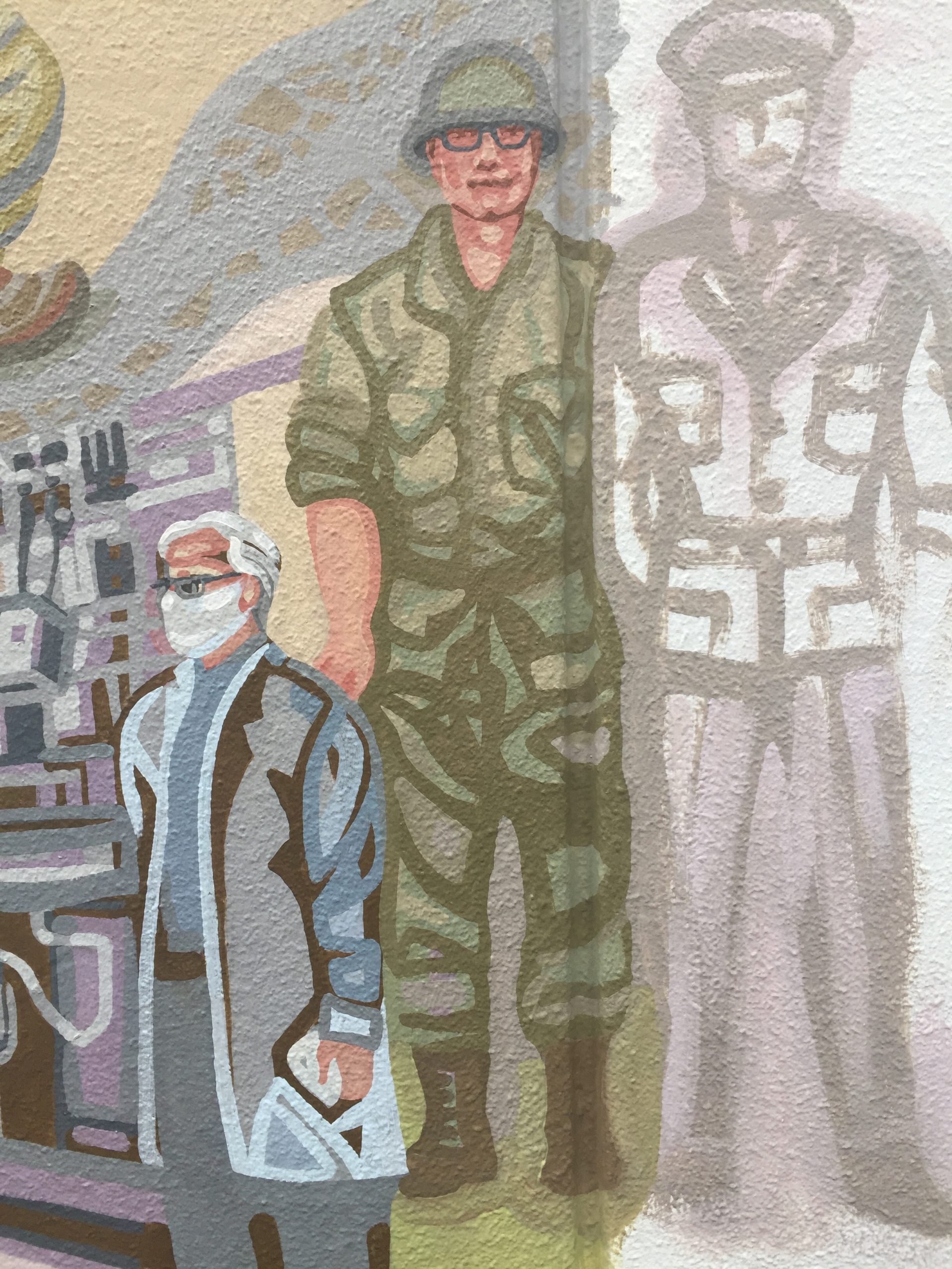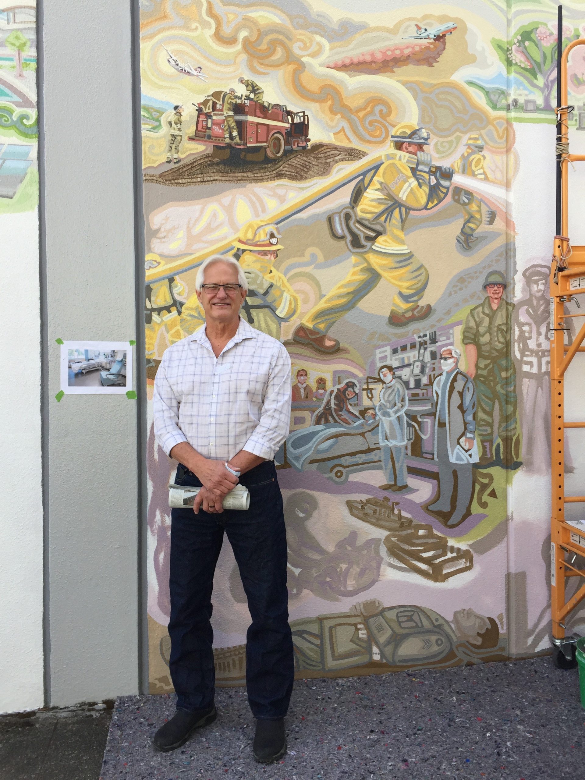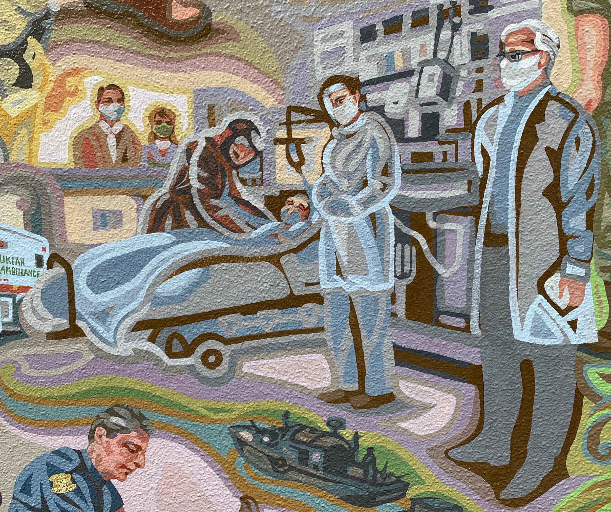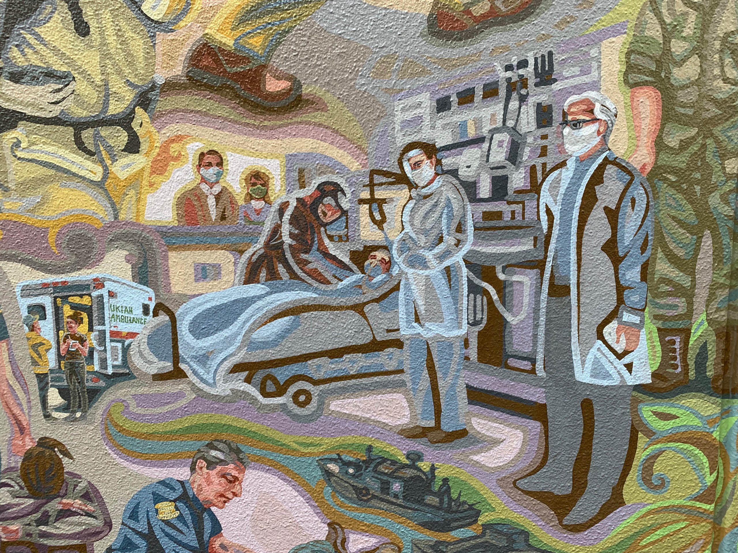 Dr. Marvin Trotter has worked in Intensive Care and local Emergency Rooms for decades. He is well known and also well recognized! During the two days painting this scene, I already observed four people recognize him in the mural, even with a mask!