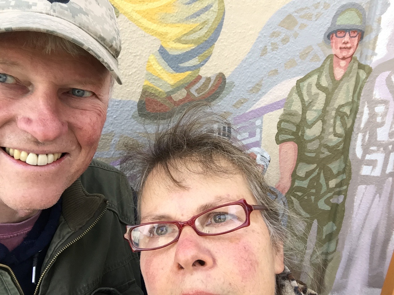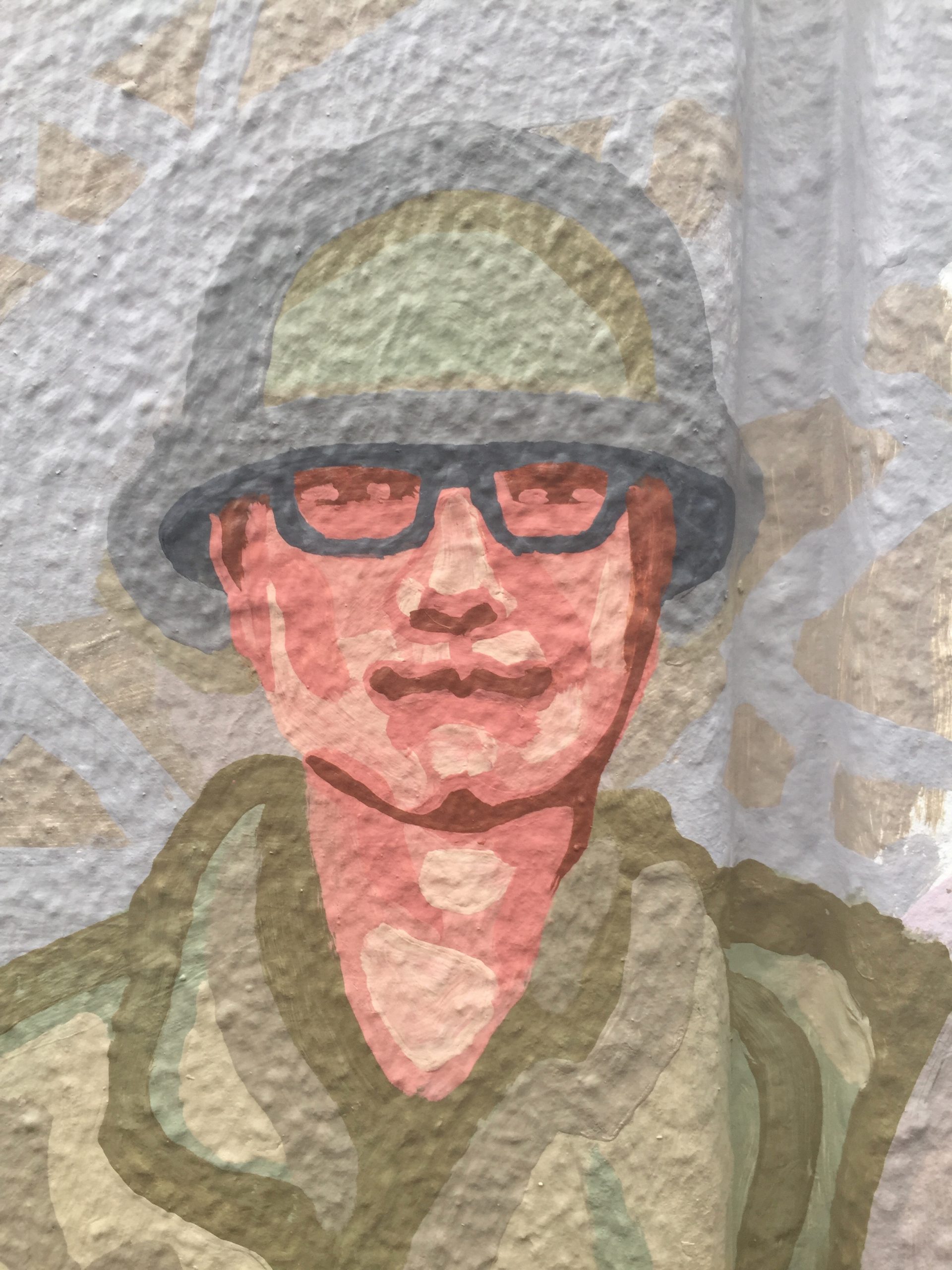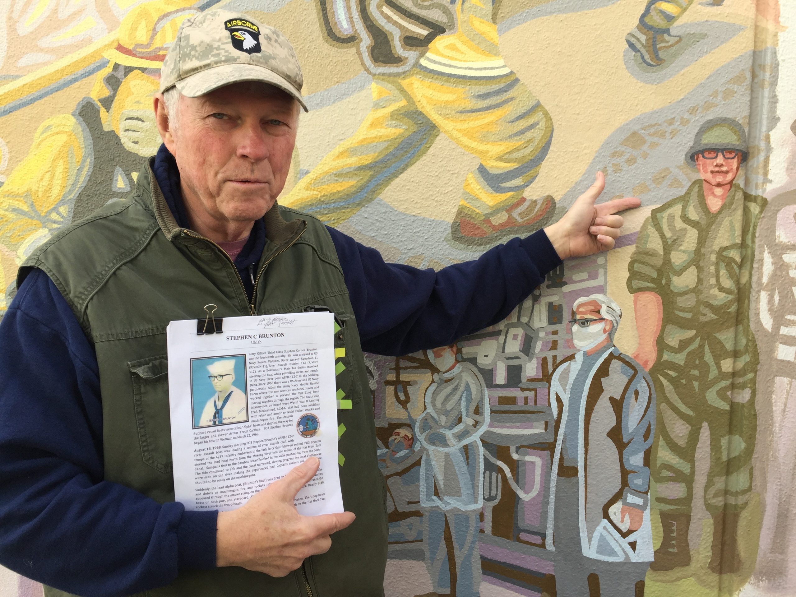 It was the last day of painting in 2021, Veteran’s Day, on the 11th day of the 11th month, which was when the armistice was signed in the 11th hour, ending World War I. My subject matter, the timing of it unplanned, was military service and I completed the 101st portrait in the mural, that of Stephen C. Brunton, one of twenty-two servicemen from Mendocino County who lost their lives in Vietnam.
