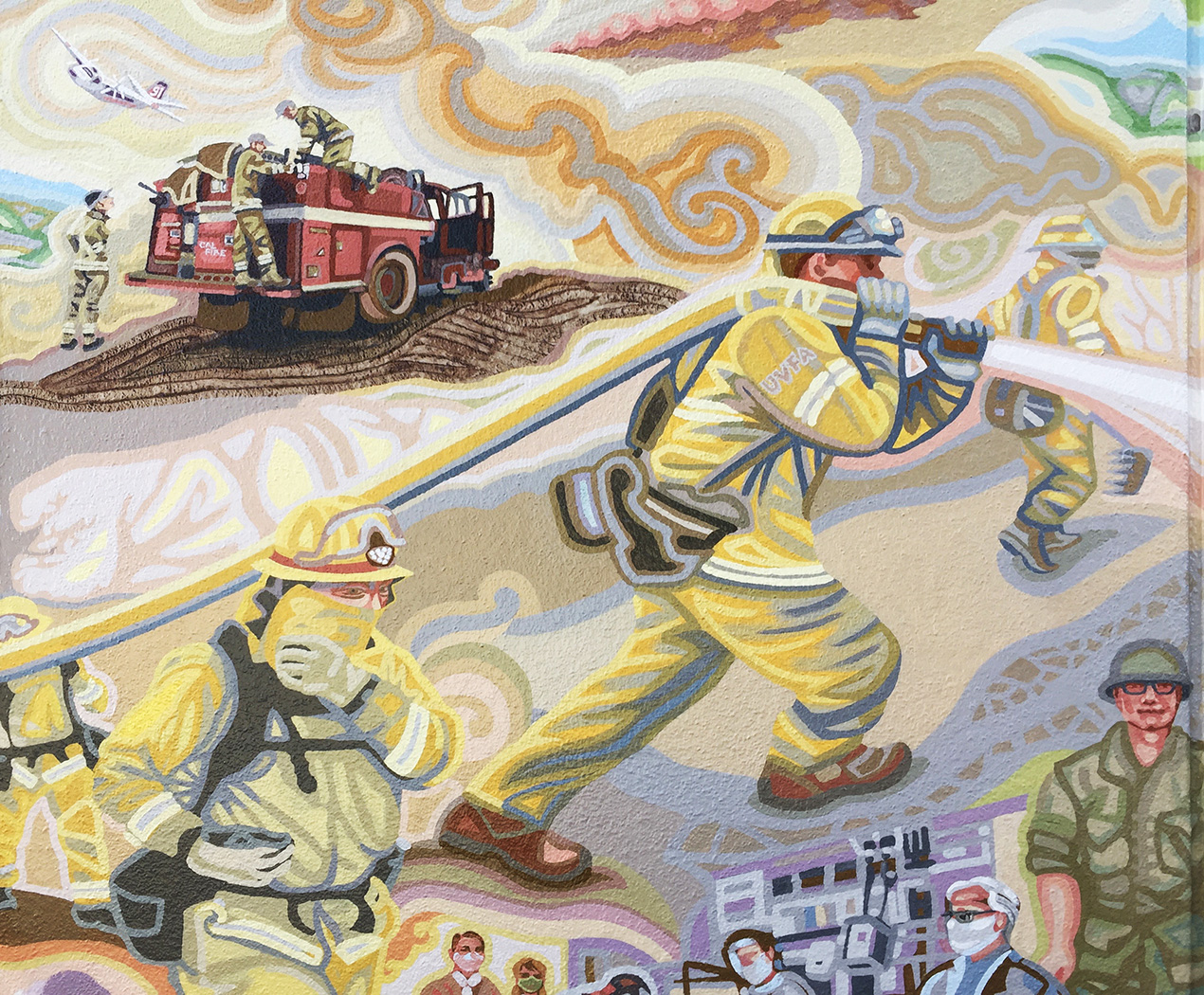 In 2020, I painted firefighters in the mural foreground from these photos.