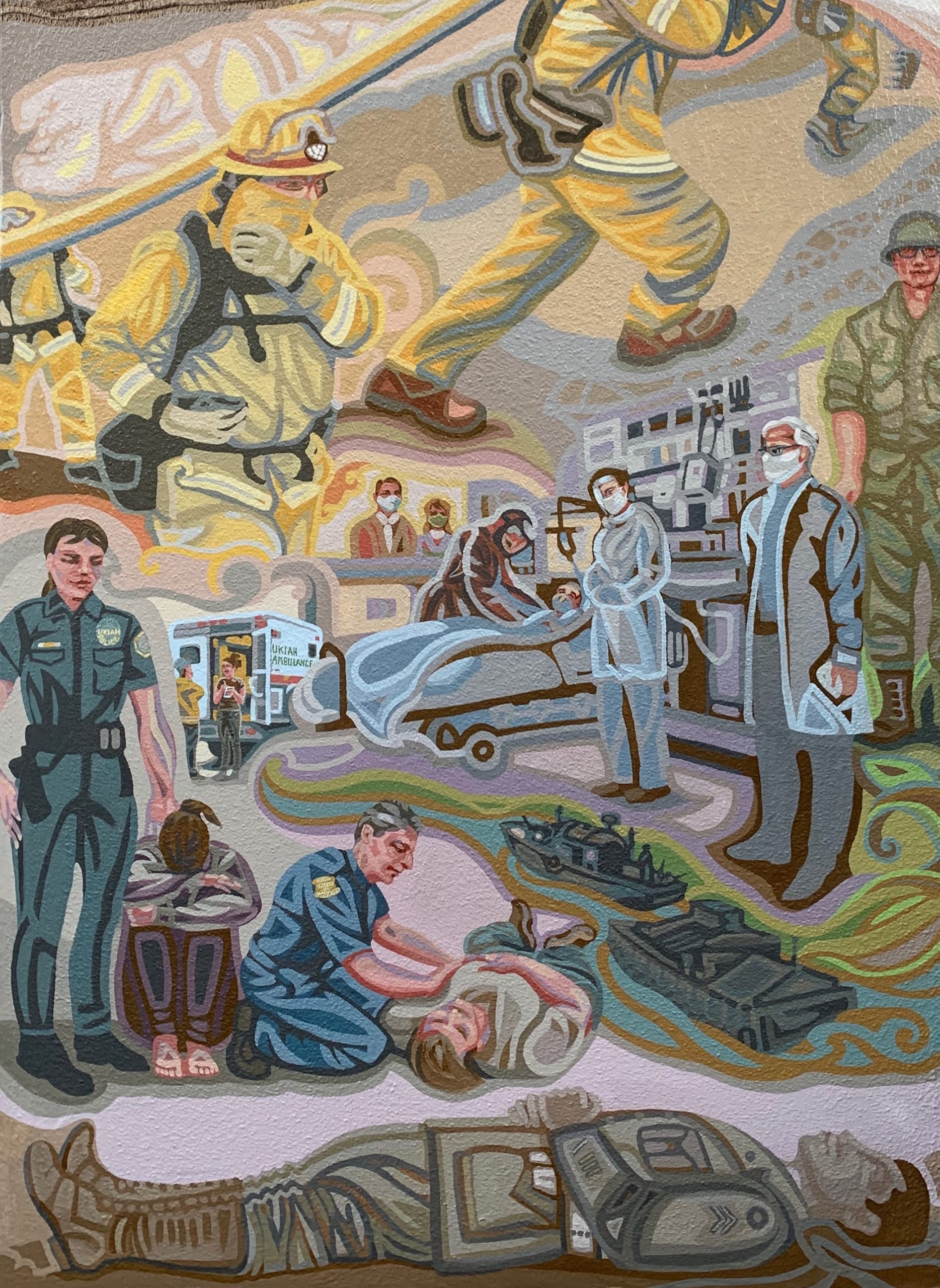 Adjacent to the military boats and the hospital scene are more familiar illustrations of service, including the work of journalists. Justine Frederiksen is a reporter for the Ukiah Daily Journal and I painted her standing in front of an ambulance reporting on an accident.