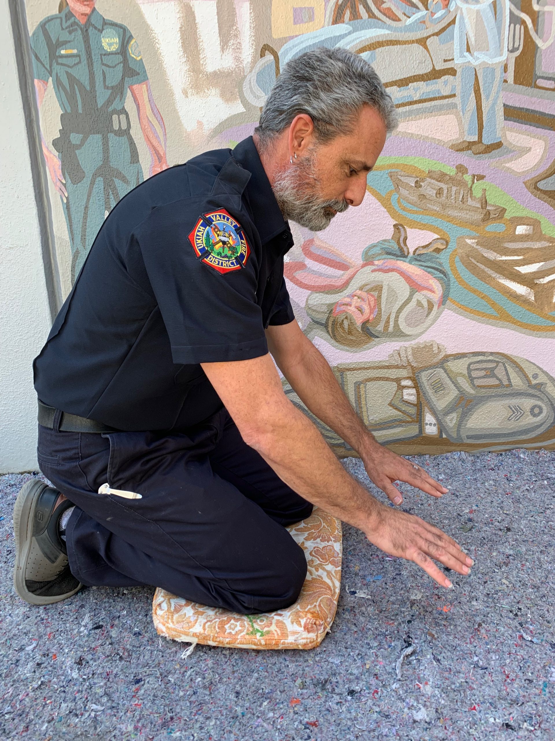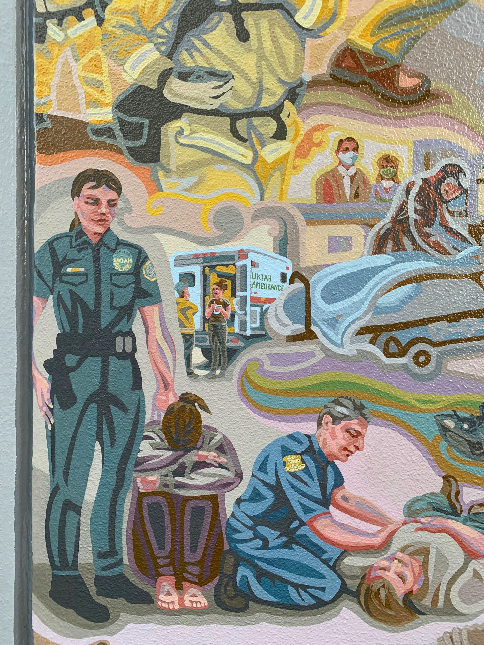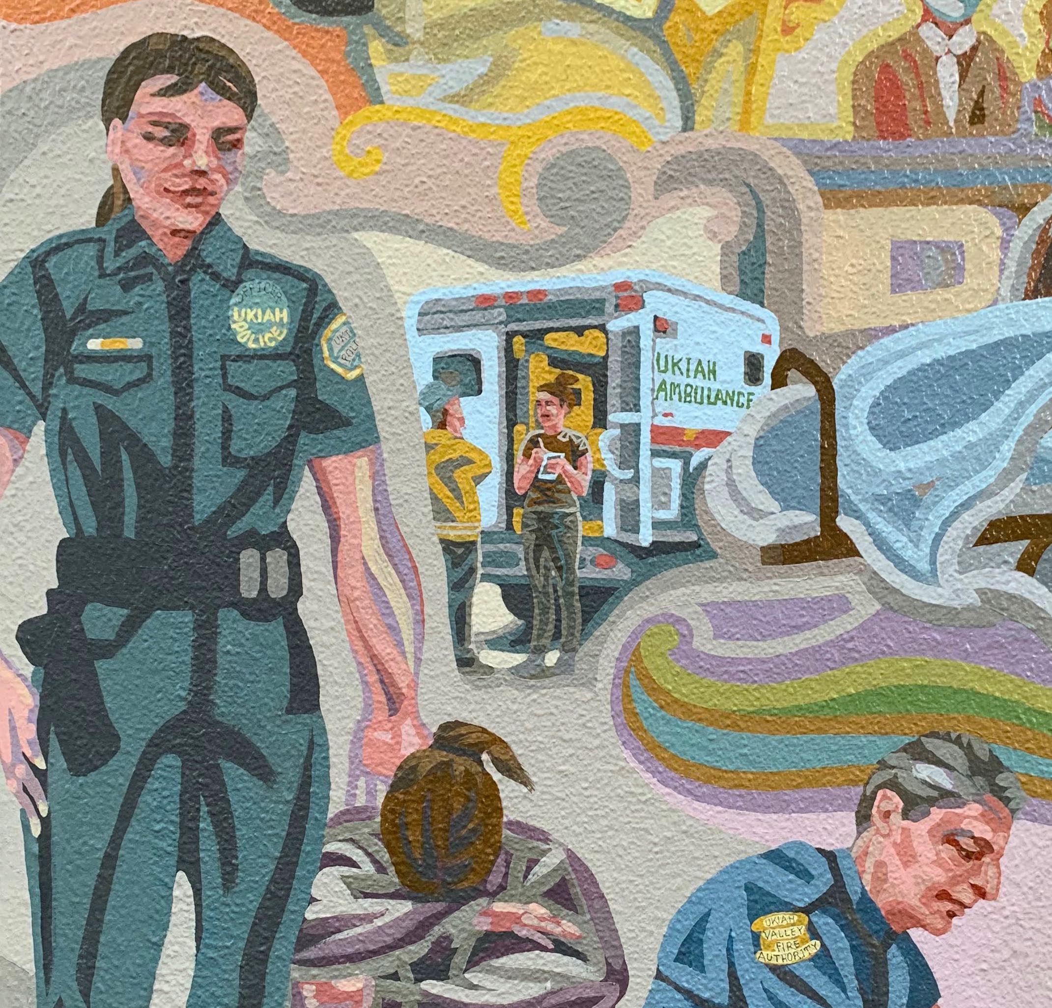 A Ukiah policewoman comforts a distraught woman and a member of the Ukiah Valley Fire Department performs resuscitation on a victim. The figure of the policewoman was inspired by Mikayla Paoli, who would regularly walk to work on Church Street.