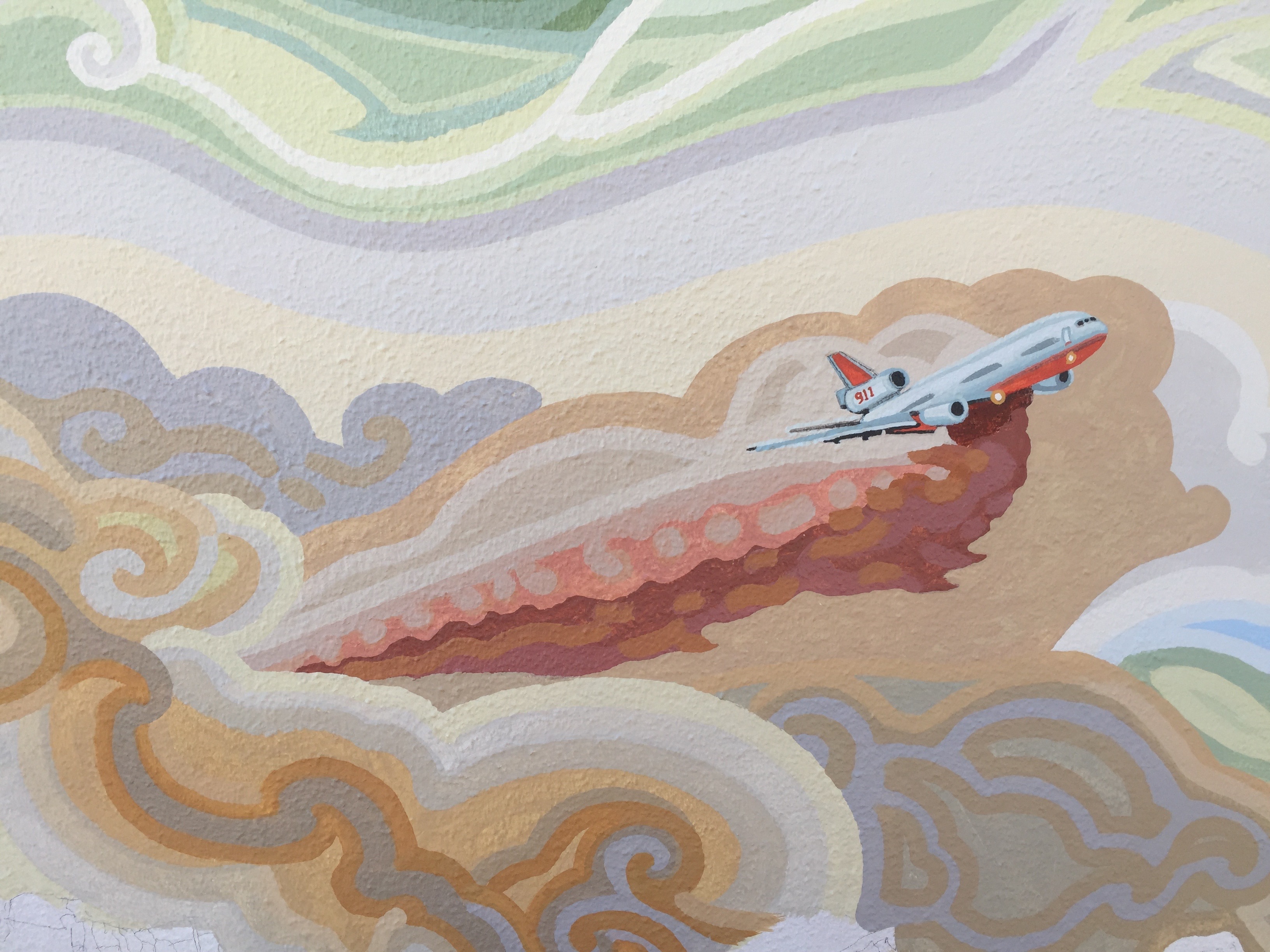 These Ranch and River fires became the Mendocino Complex wildfire, at that time the largest in California history! Through the days and weeks, we all wore face masks and I painted in the orange gloom. The town was full of firefighters from all over the state, nation and other countries. Everywhere we went, we thanked them. People wouldn’t let firefighters pay for groceries, drinks and meals. Hundreds of firefighting planes flew over the Conference Center. At some point it dawned on me that the service panel needed to be about our firefighters.