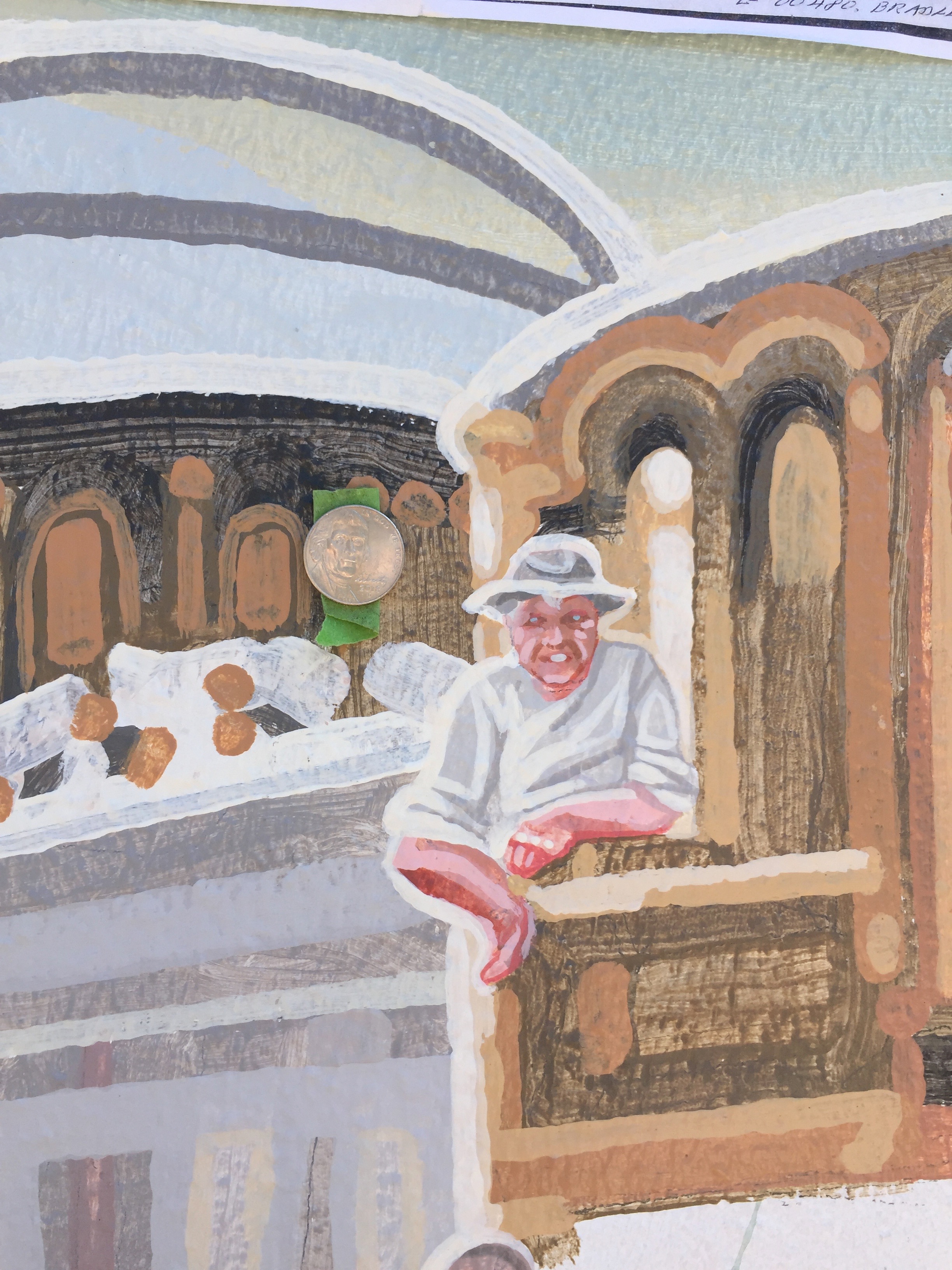 But I also added the portrait of a contemporary transportation professional. This is the smallest true portrait I have ever painted! His face is the size of a nickel. I put him in the place of the train’s engineer. For a good reason. See below: