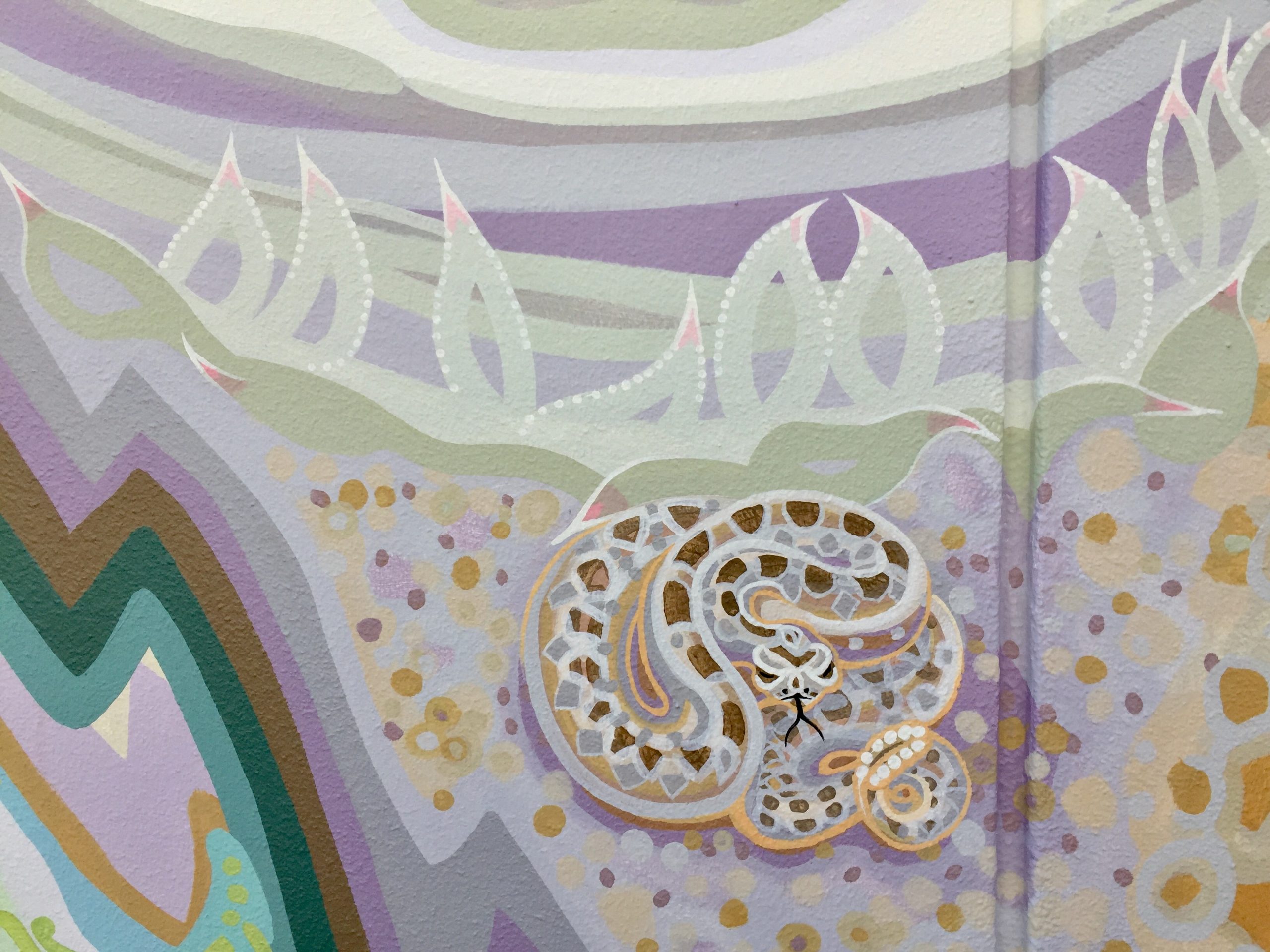 Included in the “land of plenty” side are blackberries, edible greens like miners’ lettuce and flowering tubers you could roast like potatoes, wild strawberries, clover, and a quail. On the harsh side of the divide are spiky succulents and a rattlesnake in a dry environment. For the Native people, things were about to get worse:
