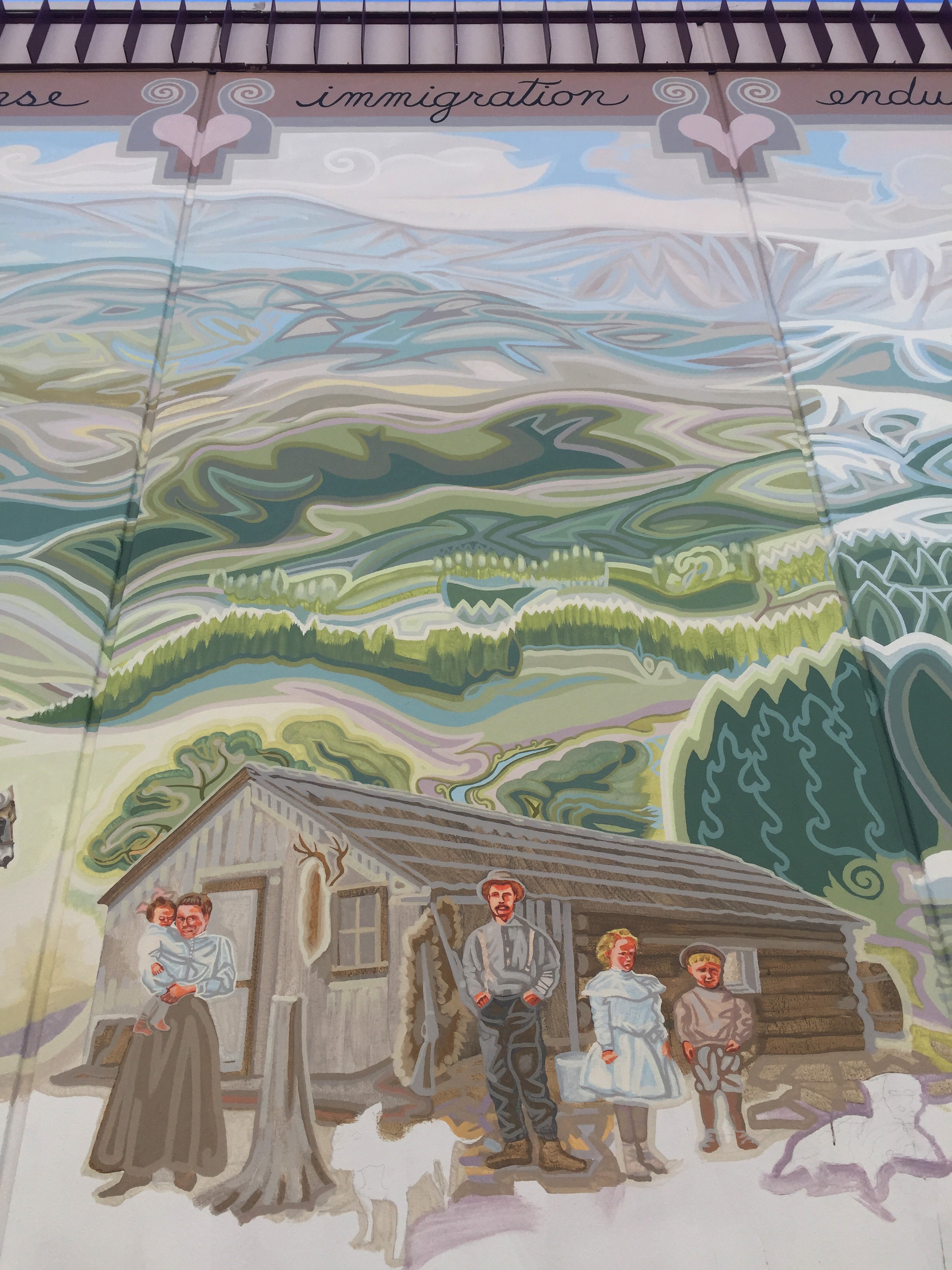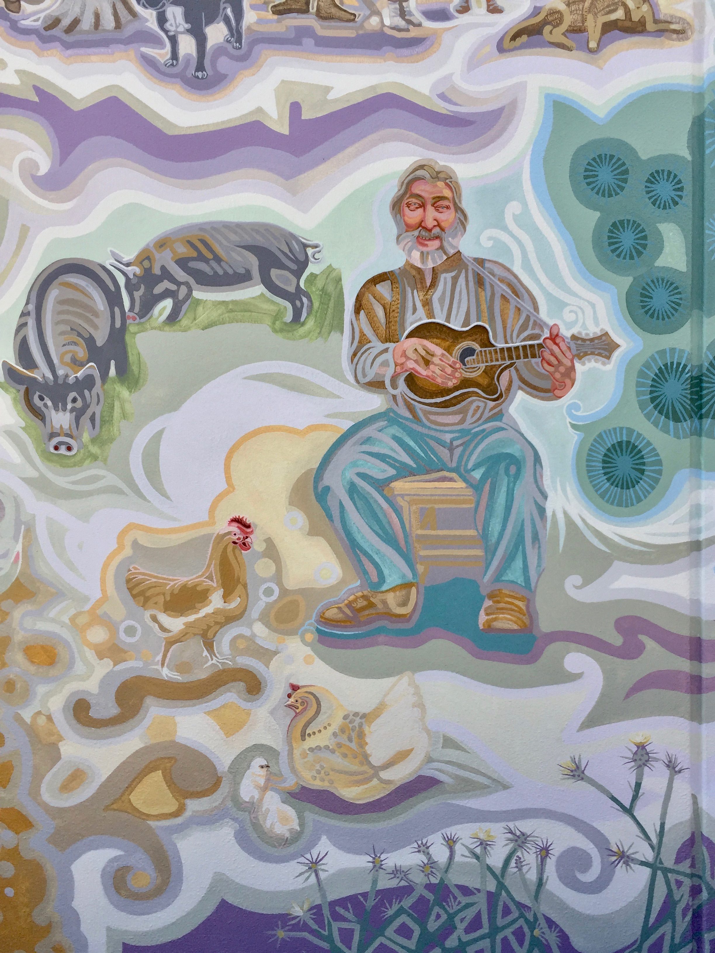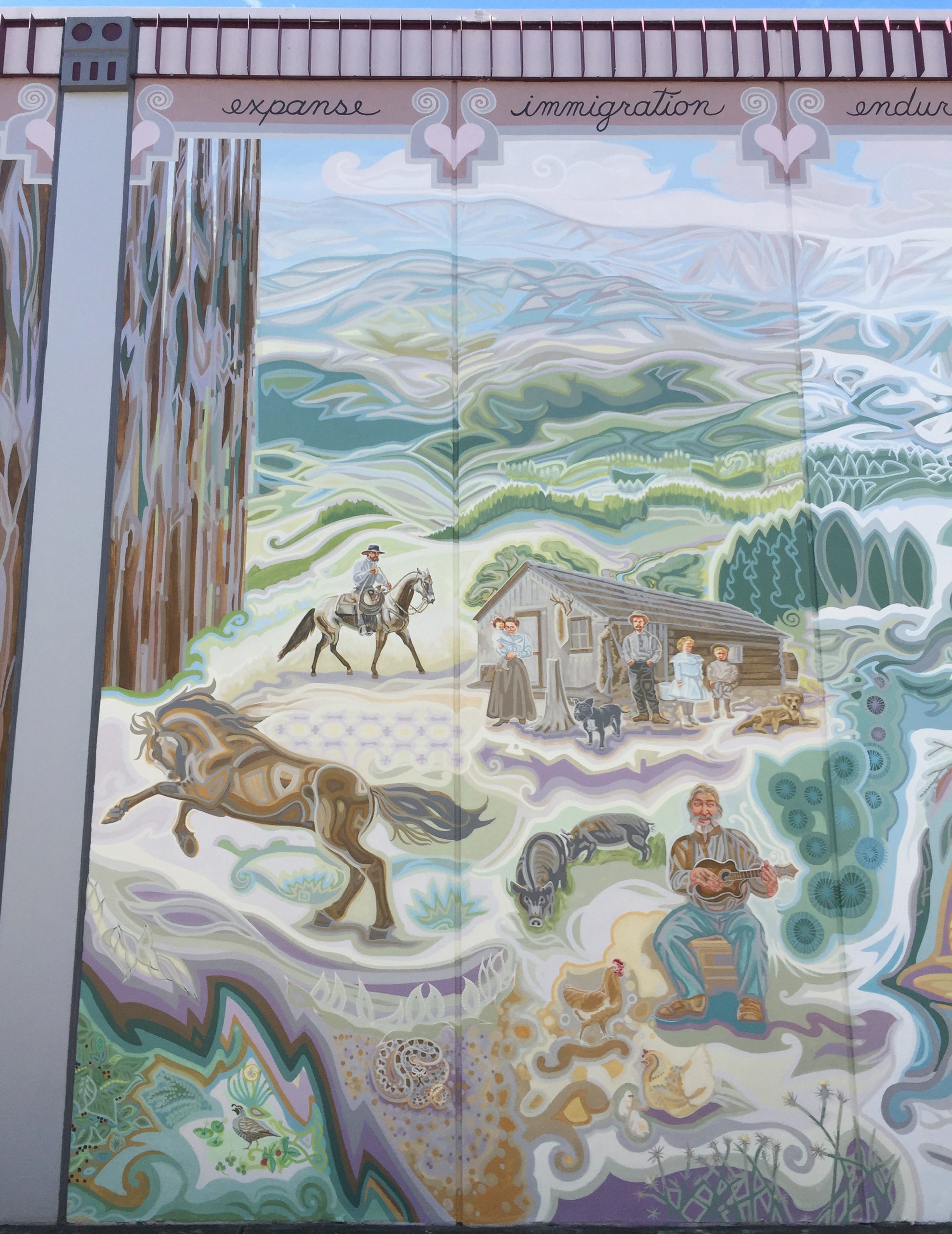 The lower half of “immigration” shows a settler playing a mandolin, which is a portrait of a contemporary person. He is Richard Shoemaker, former member of the Ukiah City Council and the Board of Supervisors, and former City Manager of Point Arena.