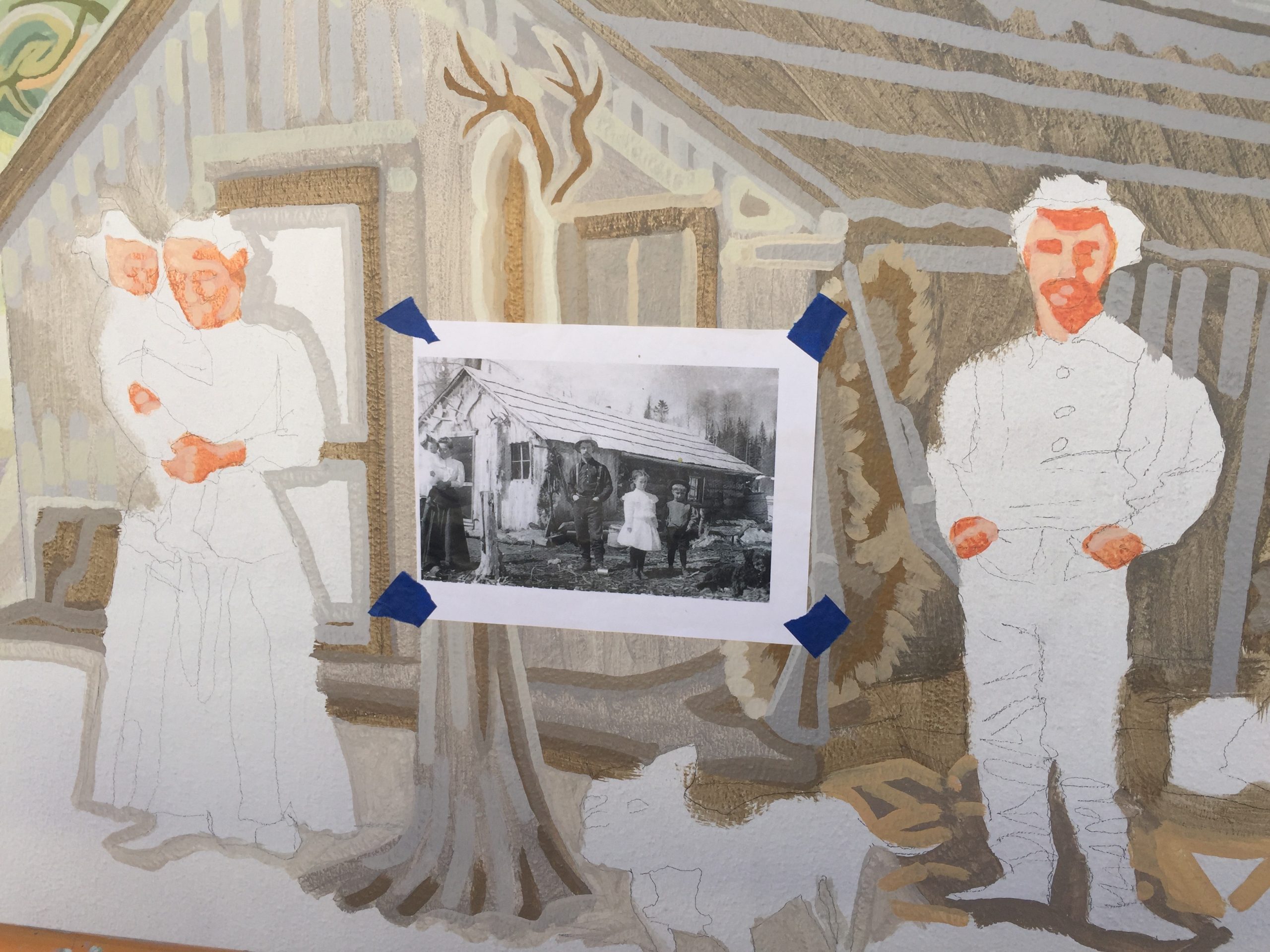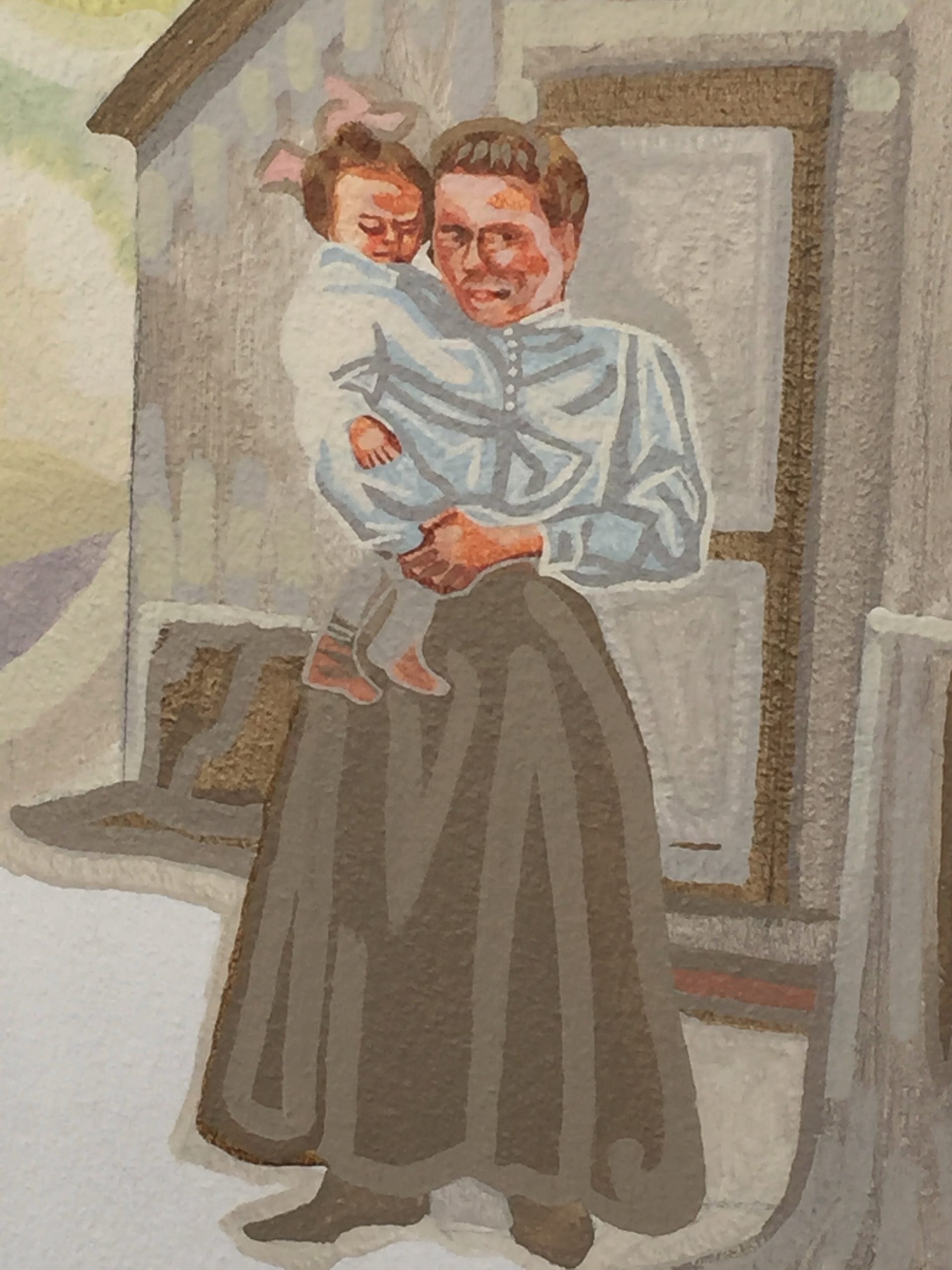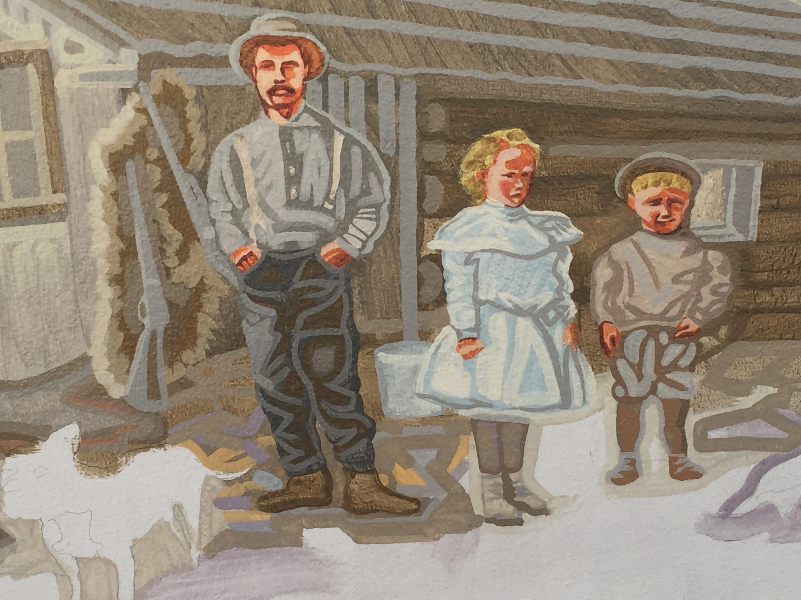 The lower half of “immigration” shows a settler playing a mandolin, which is a portrait of a contemporary person. He is Richard Shoemaker, former member of the Ukiah City Council and the Board of Supervisors, and former City Manager of Point Arena.